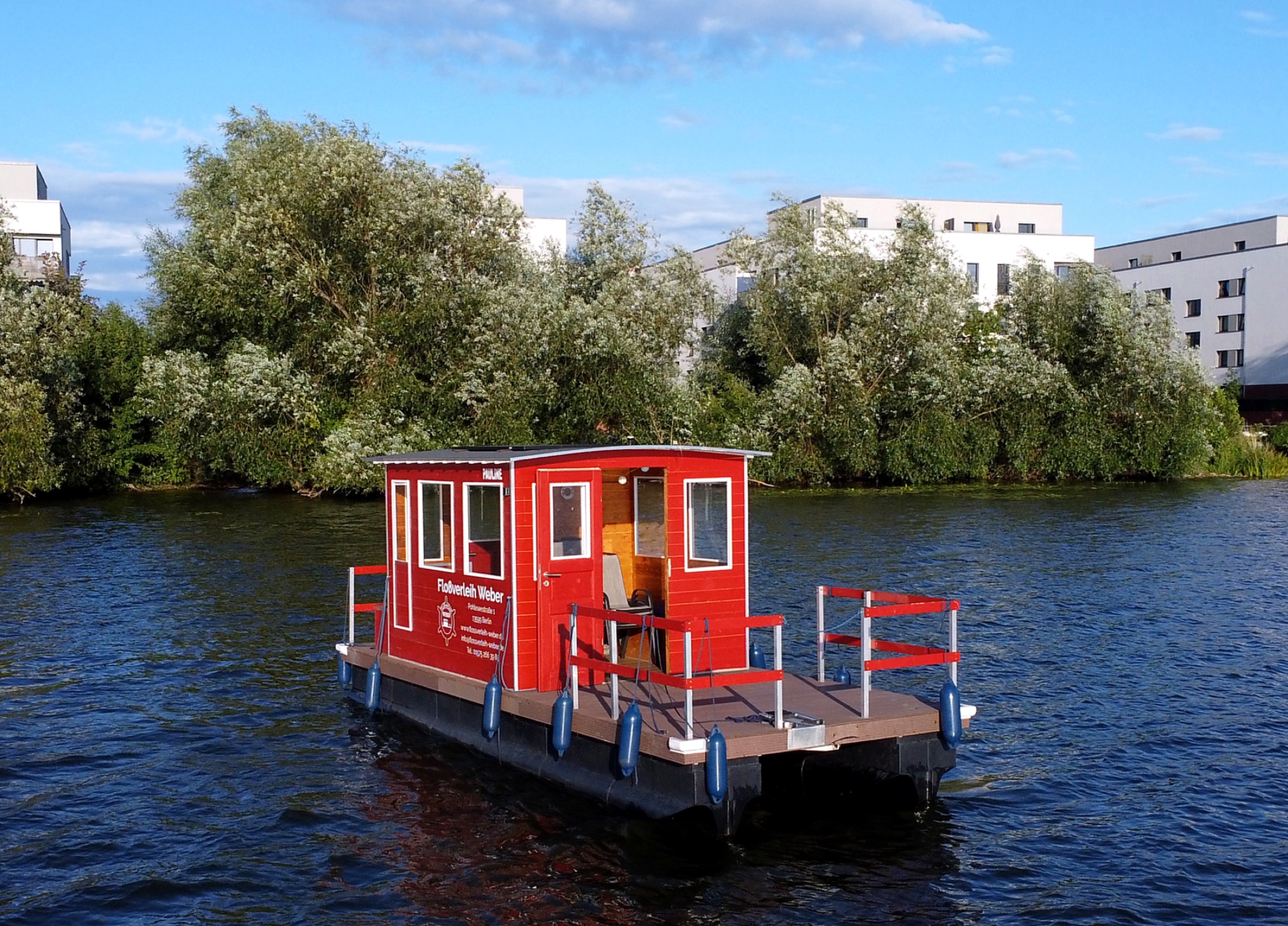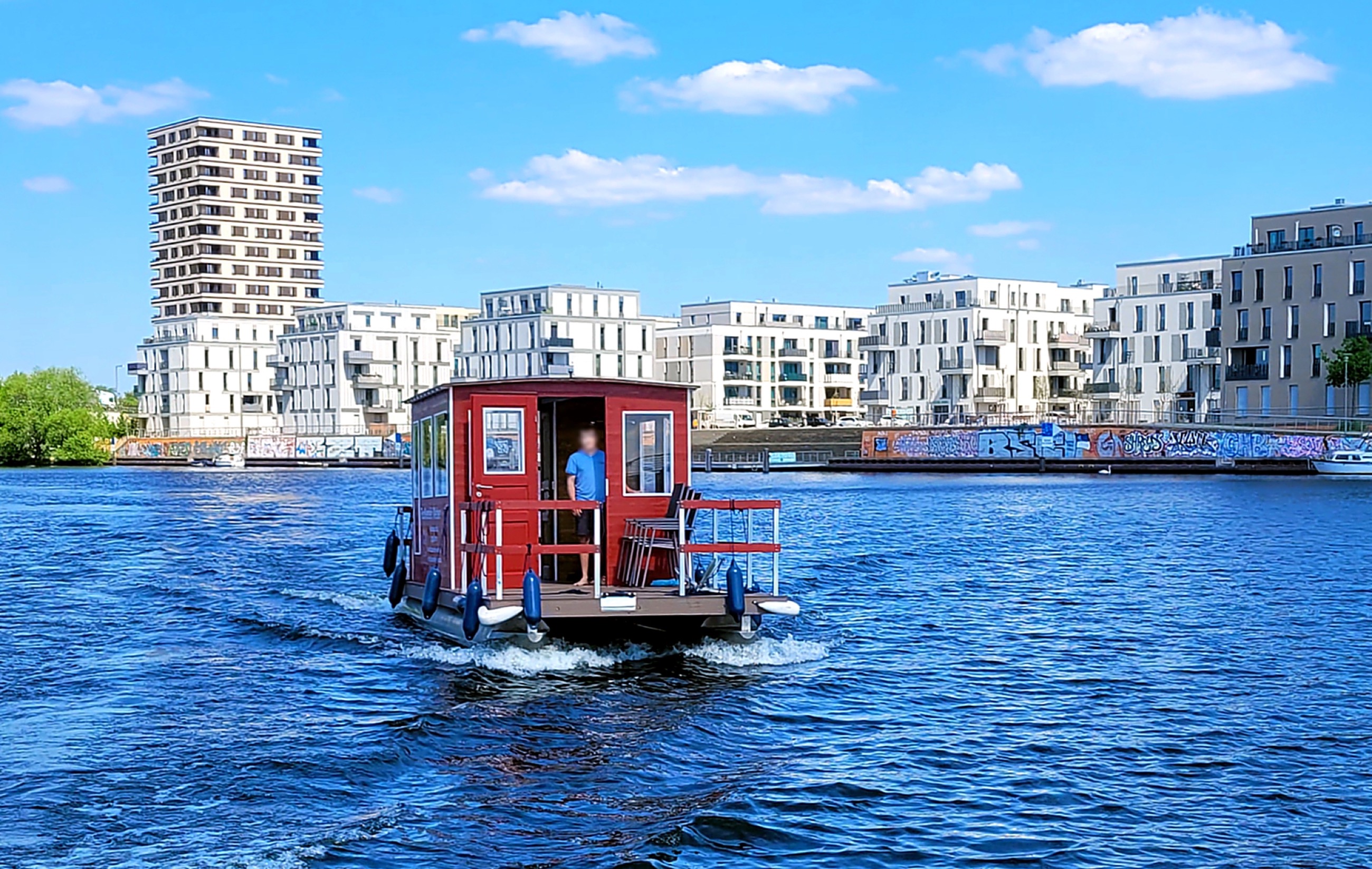 A large terrace offers space to relax, sunbathe and have a picnic together. In the spacious interior (3 m x 2.50 m) with a standing height of 2 m you will find seating and the steering position as well as a small shelf to store your food. There is a separate toilet cabin on the raft.