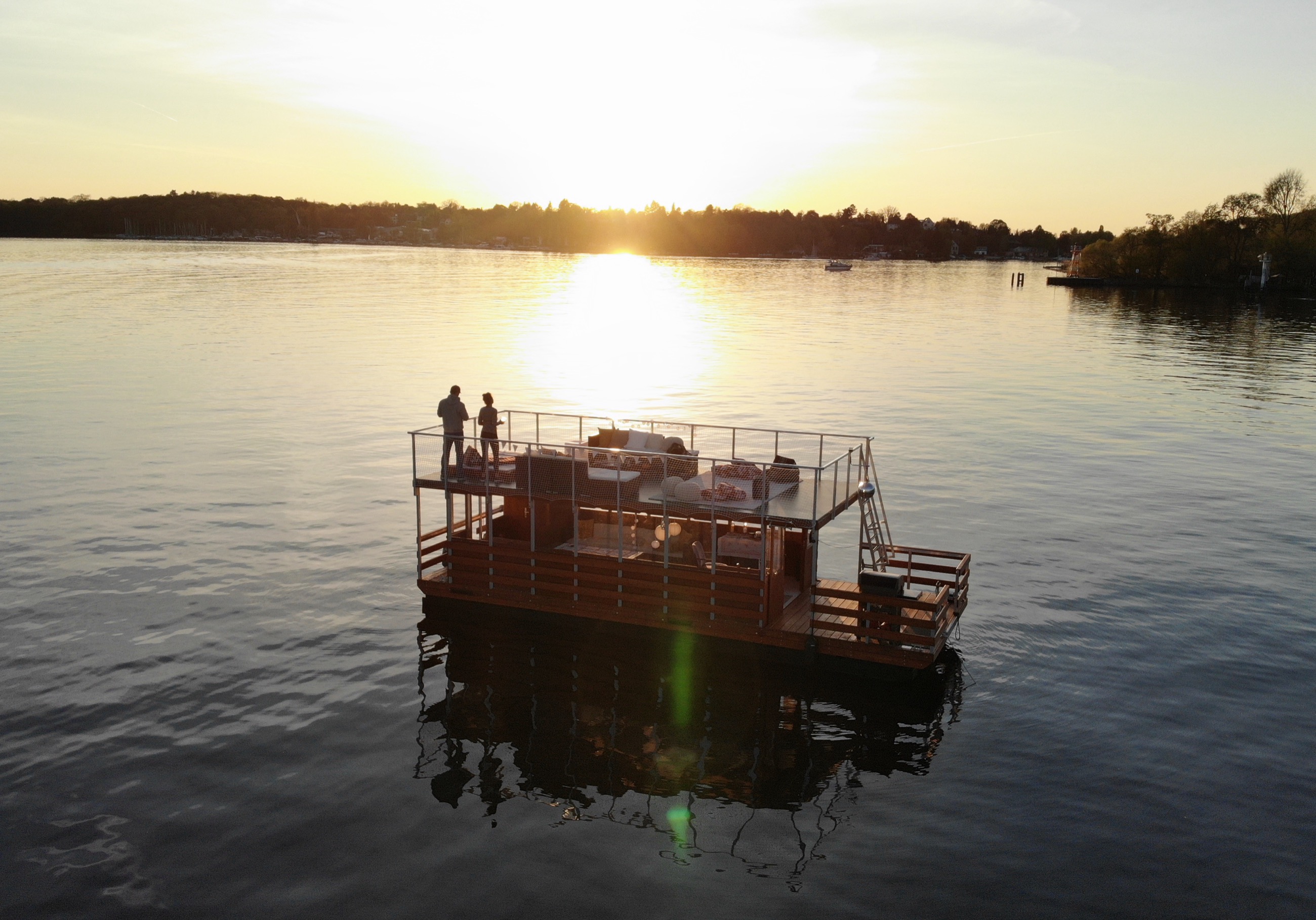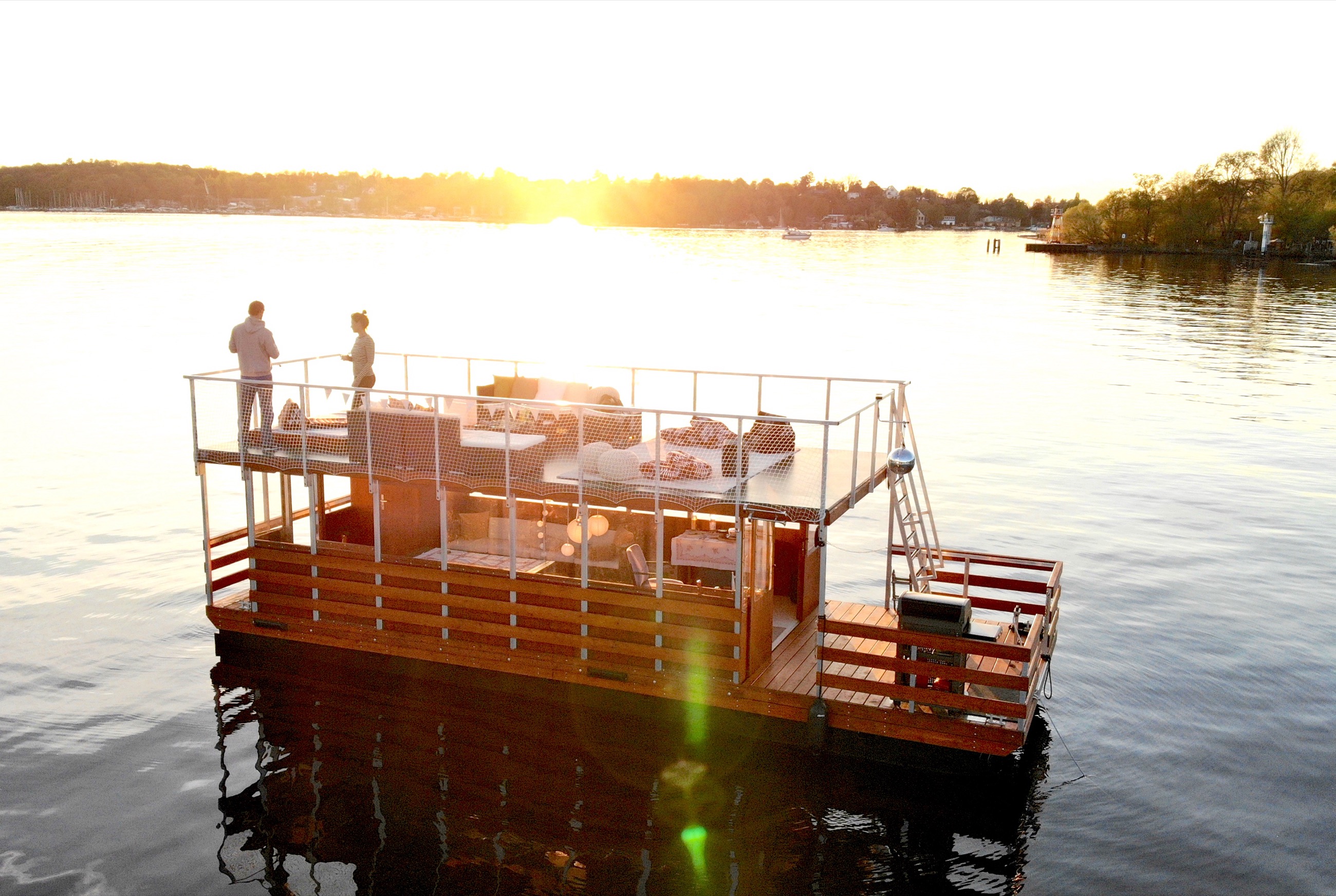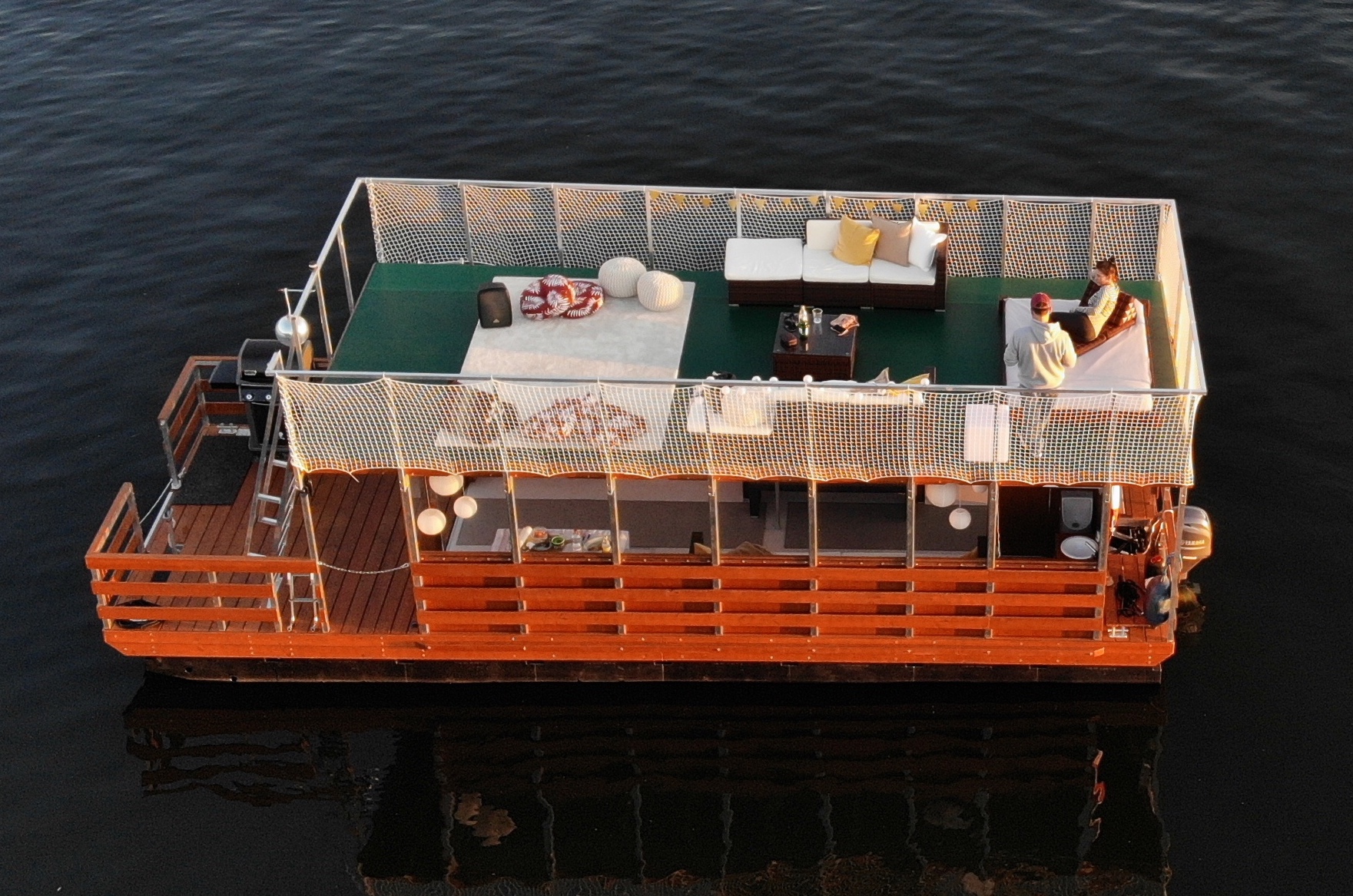 We recommend this raft for company events, hen parties and swimming tours. You can bring your own food and drinks (free of charge) but you have to take care of your trash afterwards. This boat is not suitable for excessive parties with loud music and DJ.