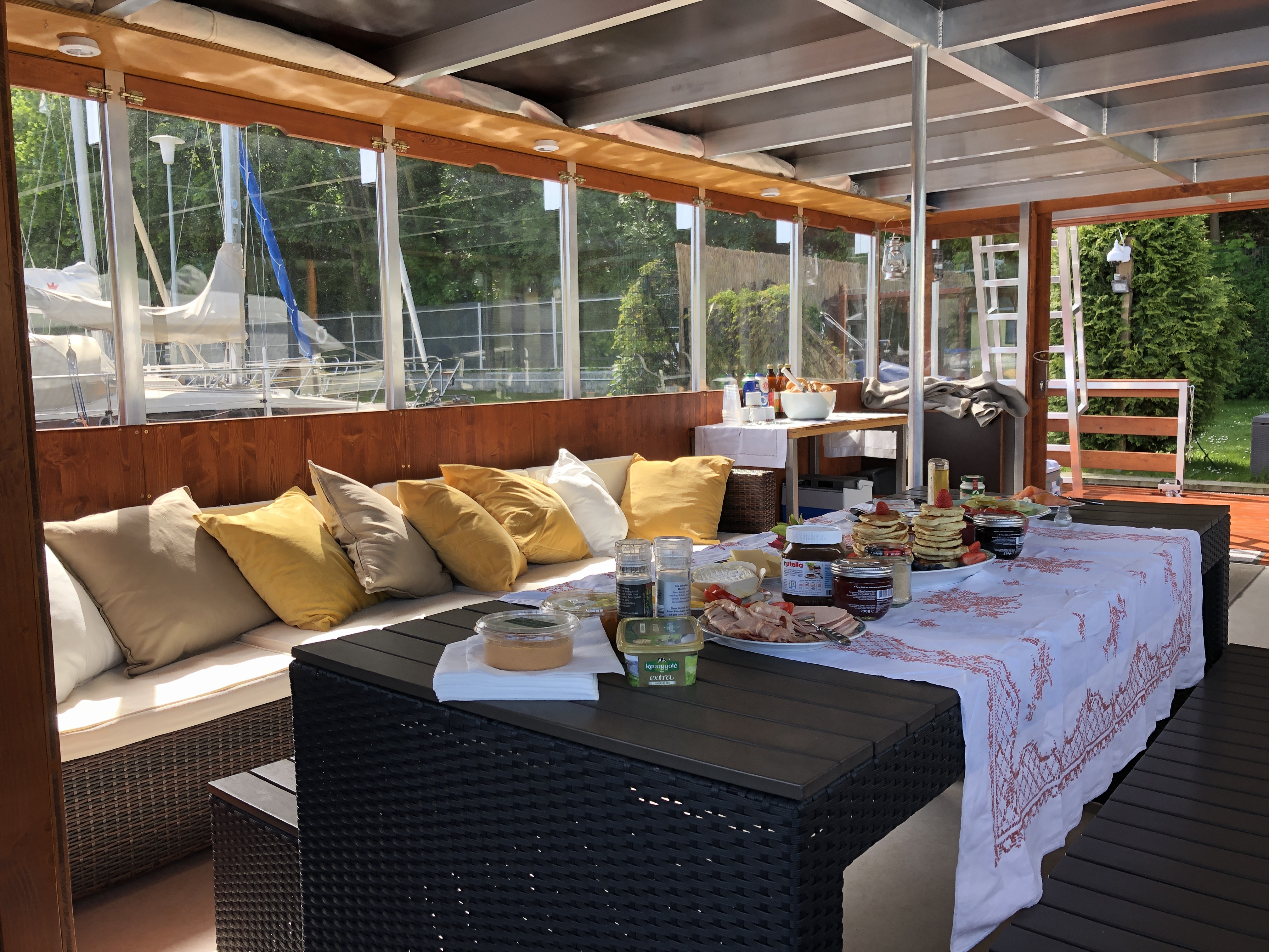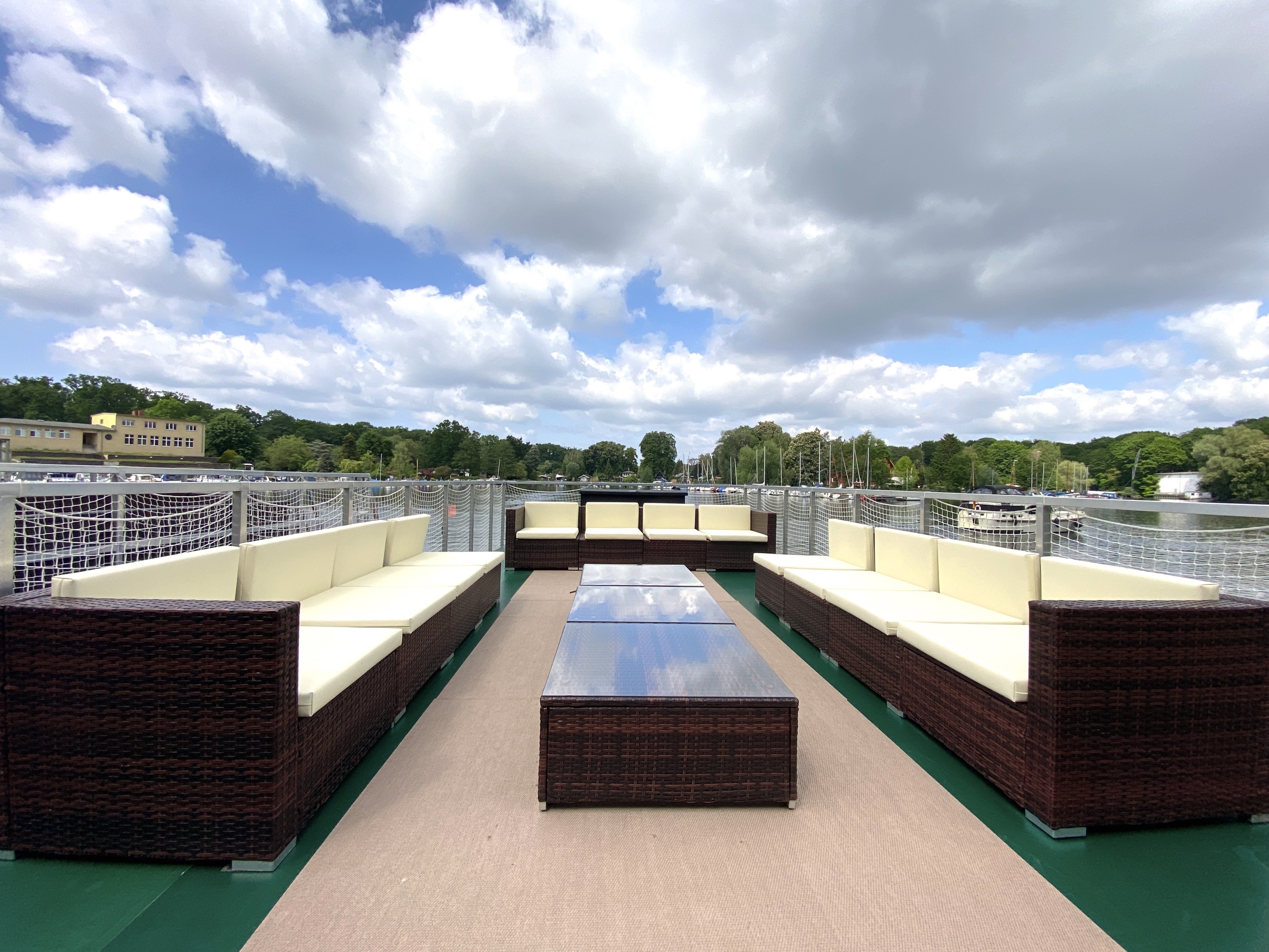 Sail across the Havel River on our favorite raft and anchor on beautiful beaches. The sun deck is equipped with elegant lounge furniture. In case of rain, the houseboat can be completely closed. There is a bathroom with toilet and washbasin on board. The Beluga has been leading our top 5 most popular rafts for two years. Rent this barbecue boat for exclusive swimming trips.