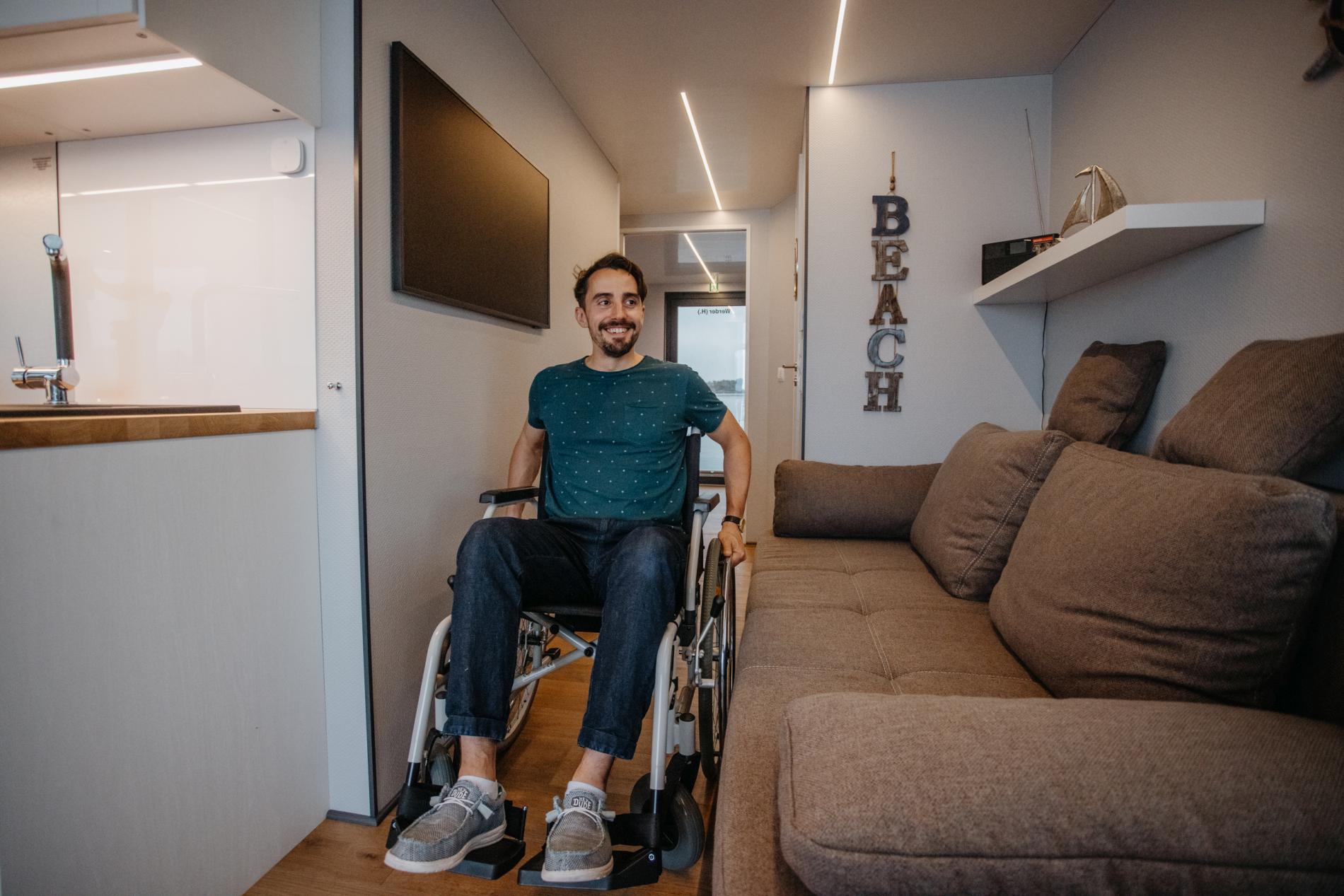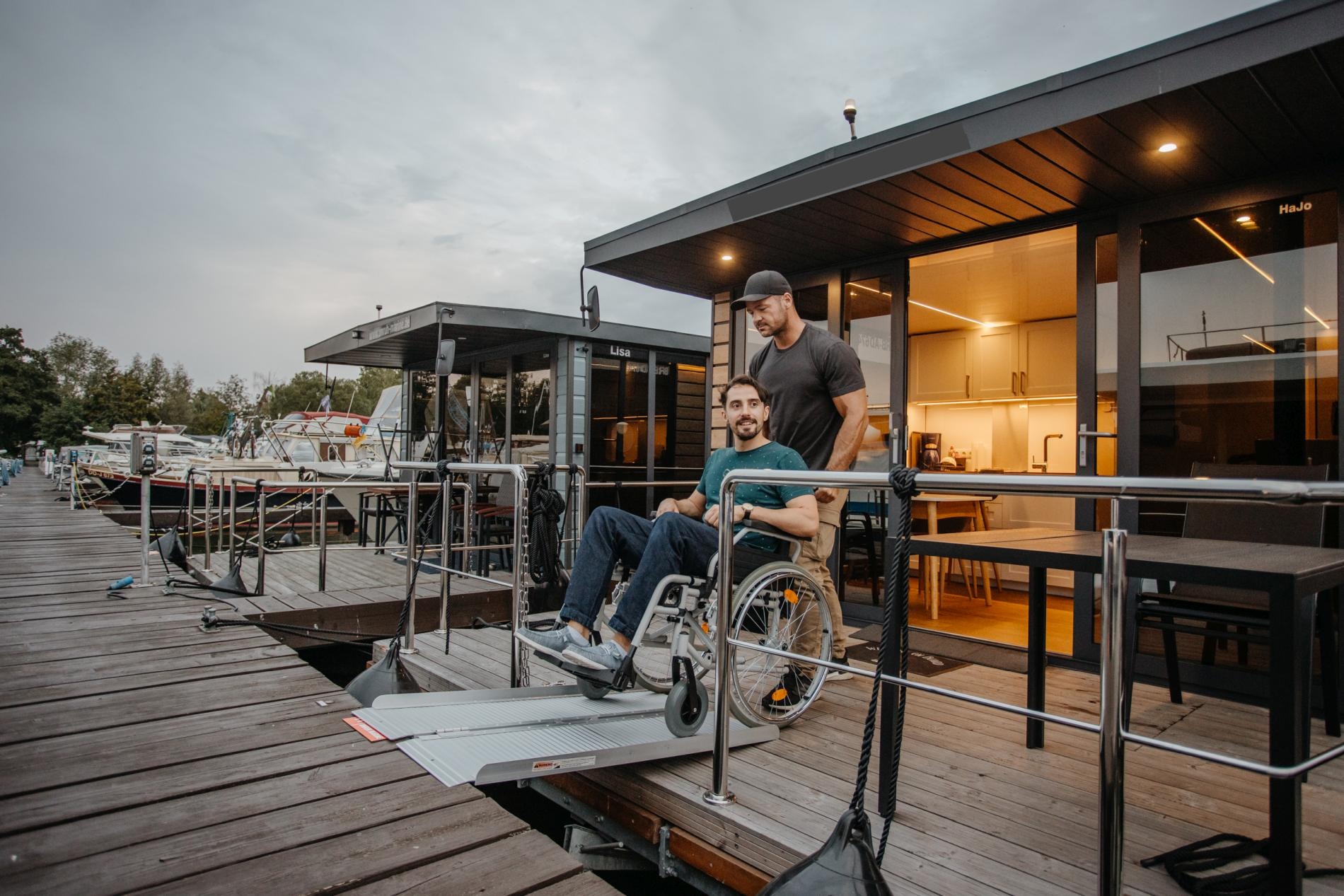 "HaJo" is an approx. 30m² large and comfortable houseboat that is also suitable for wheelchair users. Thanks to a mobile ramp, you can access the living area via the terrace, which is furnished with cosy chairs and a table. The large sliding glass doors and panoramic windows with blinds provide plenty of light and a cosy atmosphere. The living room is stylishly furnished with a comfortable sofa that can be converted into a sofa bed, TV, dining table and chairs. There is also a fully equipped kitchenette with fridge/freezer, two-burner gas hob, coffee machine, kettle and toaster. The underfloor heating in the hallway, living room and sanitary area ensures pleasant warmth, even on cold days.