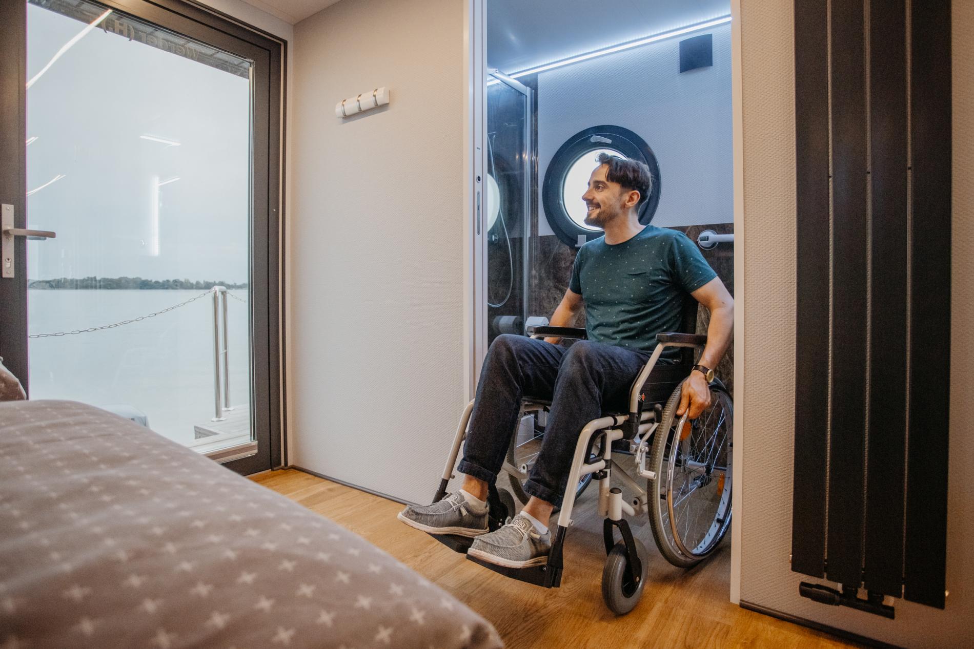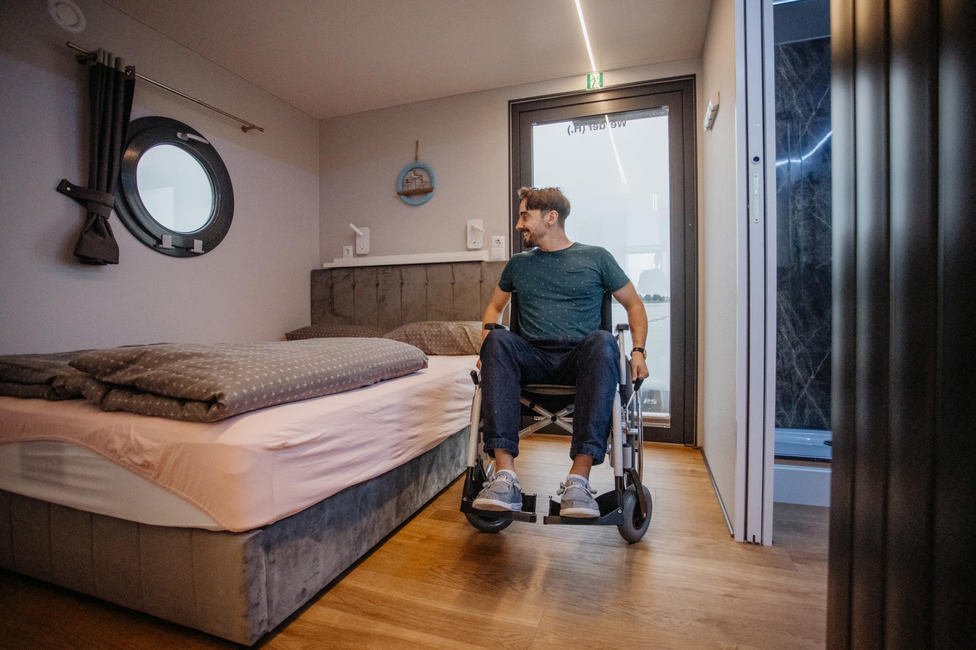 The cosy bedrooms are each equipped with radiators. The first bedroom is also easily accessible with a wheelchair thanks to the 90 cm wide sliding door. The two single beds measuring 80x200 cm can be pushed apart if required. The adjoining bathroom is equipped with an accessible shower with a seat, a washbasin and an electric toilet with a folding grab rail. The second bedroom also has two 80x200 cm beds that can be pushed together and a wardrobe. The second bathroom has an electric WC and a washbasin.