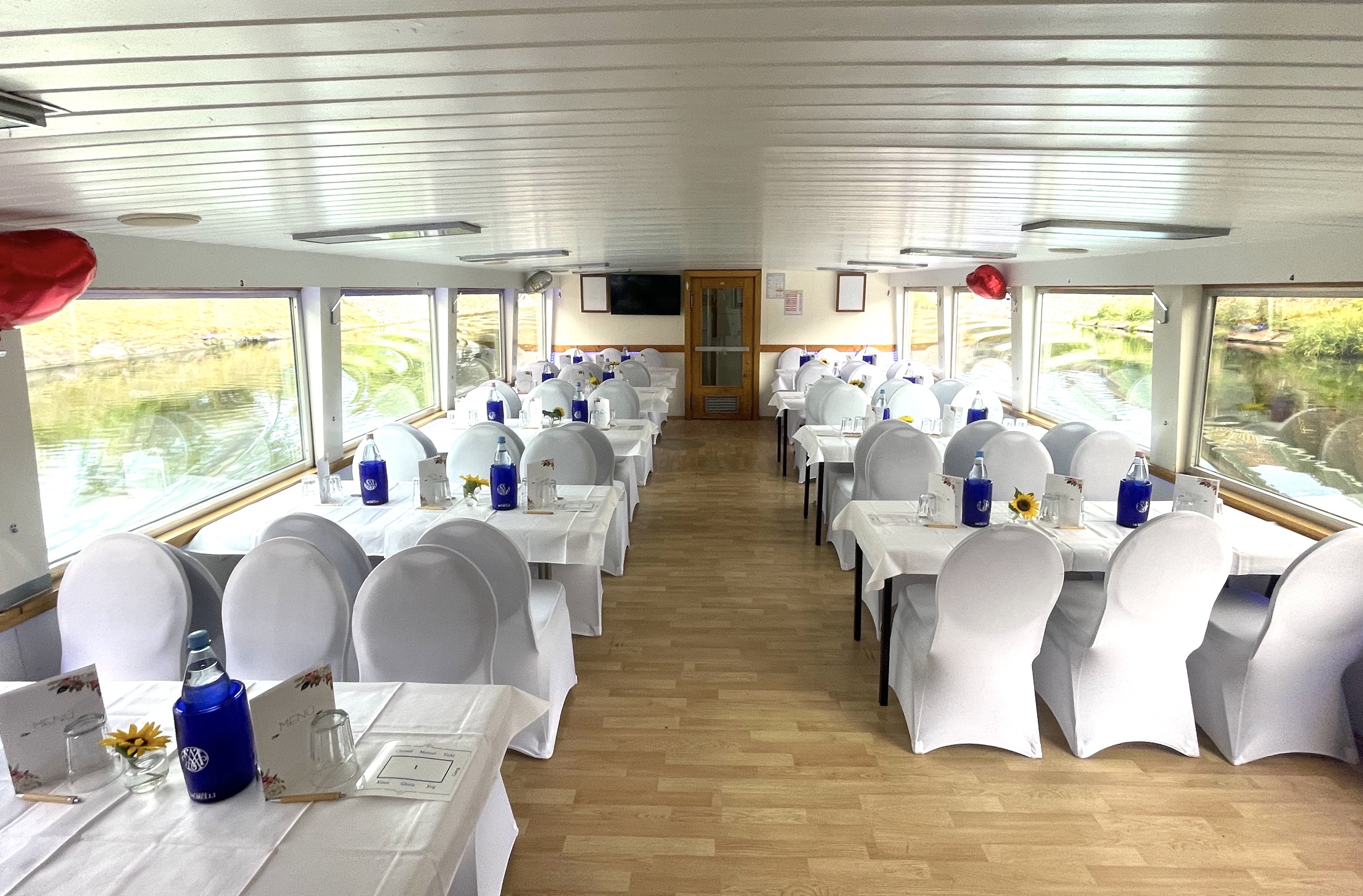 The large salon can be individually seated for any event. Also for parties the salon offers a large dance floor. The crew on board will provide you and your guests with an with a wide range of beverages, draft beer and cocktails. Catering can be ordered from our our partners for you.