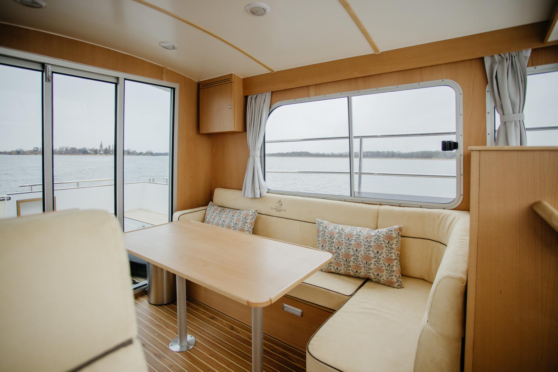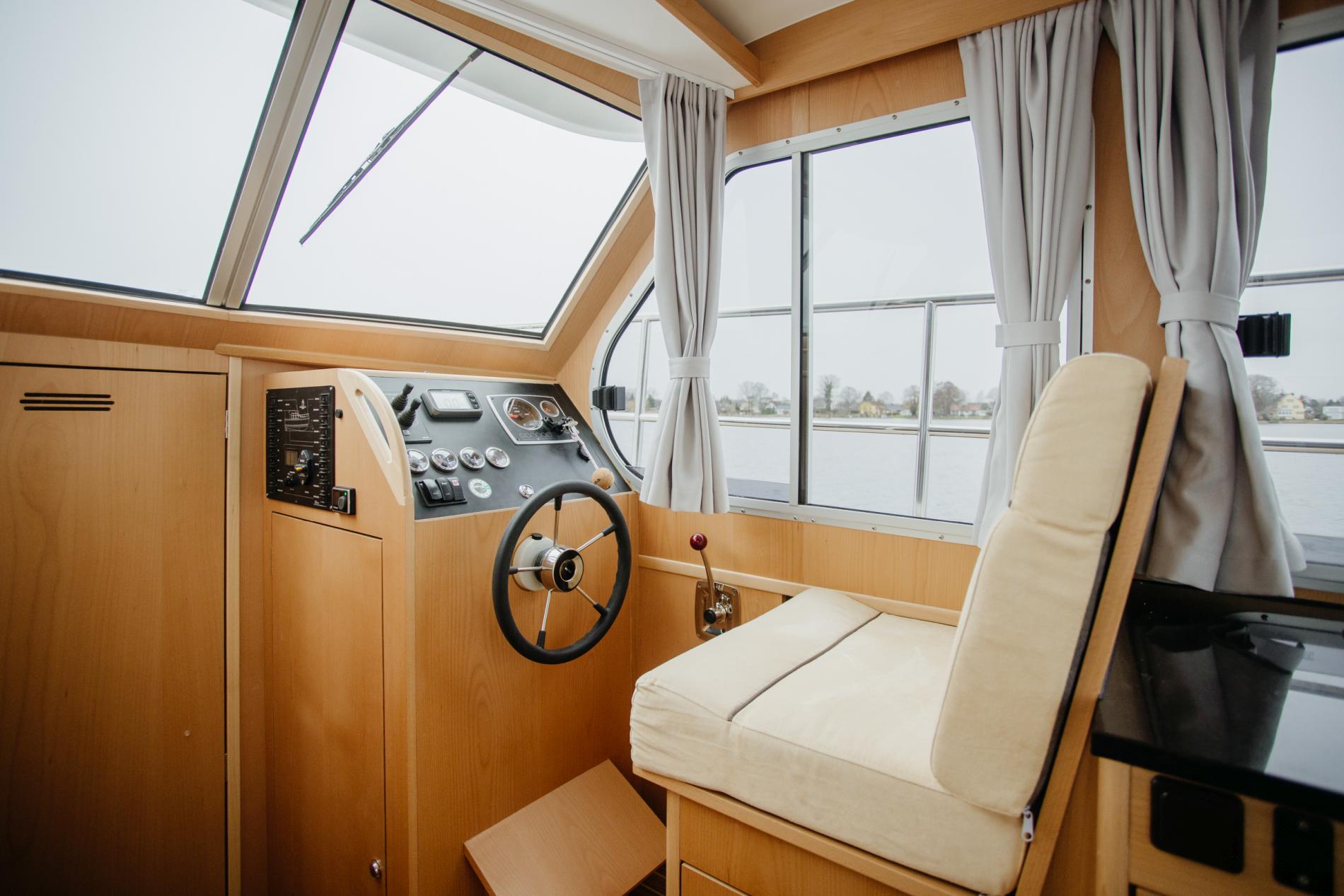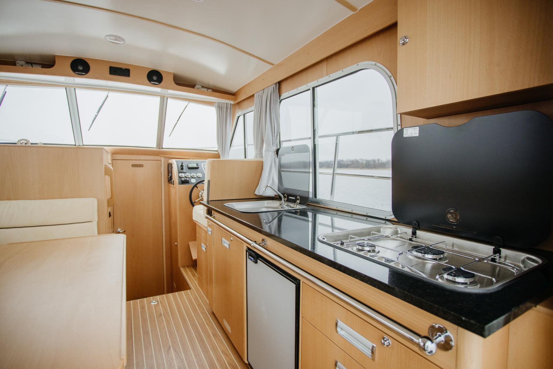 The boat is ideal for couples. The saloon, cockpit and bathing platform are all on one level, making it perfect for our four-legged friends. There is a V-berth with lockers in the bow cabin. The wet room with toilet has a washbasin and a shower. The saloon has an L-shaped settee (convertible to a U-shaped settee and double bed) and table. The kitchenette has a fridge, sink and cooker.