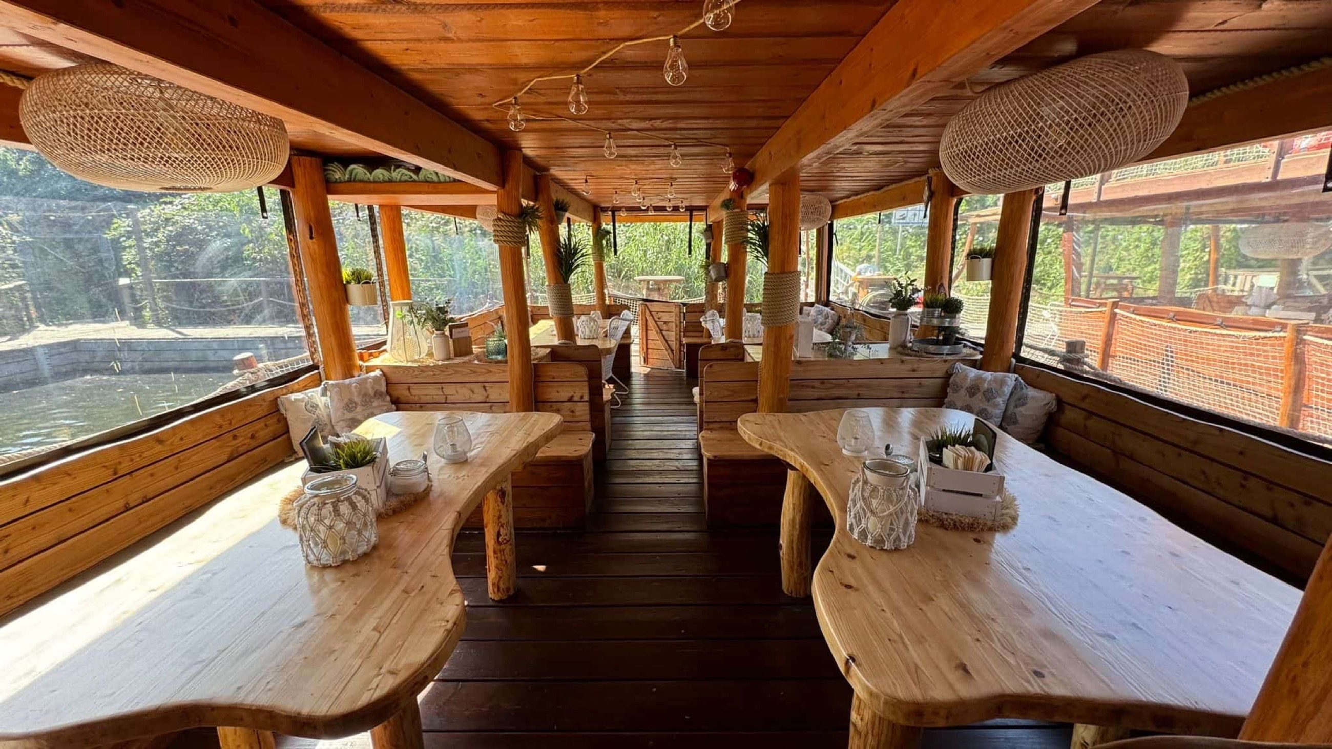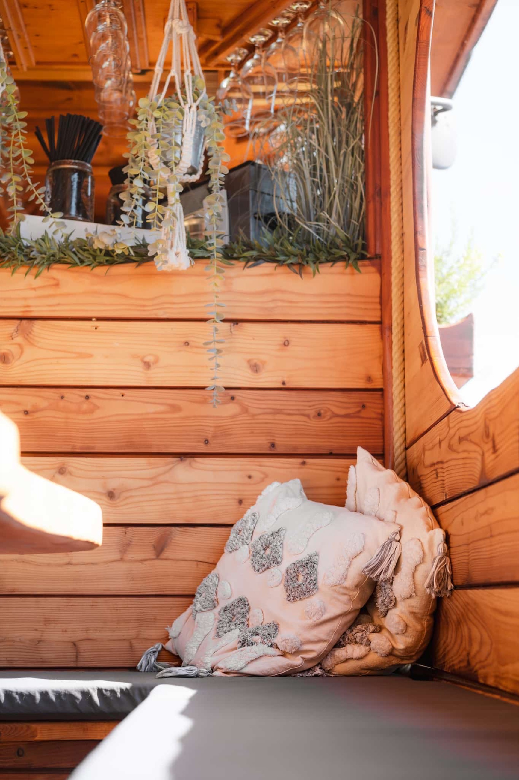 The large sun deck invites you to unwind – whether under the open sky or shaded beneath the sun sail. Inside, you’ll find a warm and welcoming vibe with wooden accents, green plants, and nautical decor that make you feel right at home.