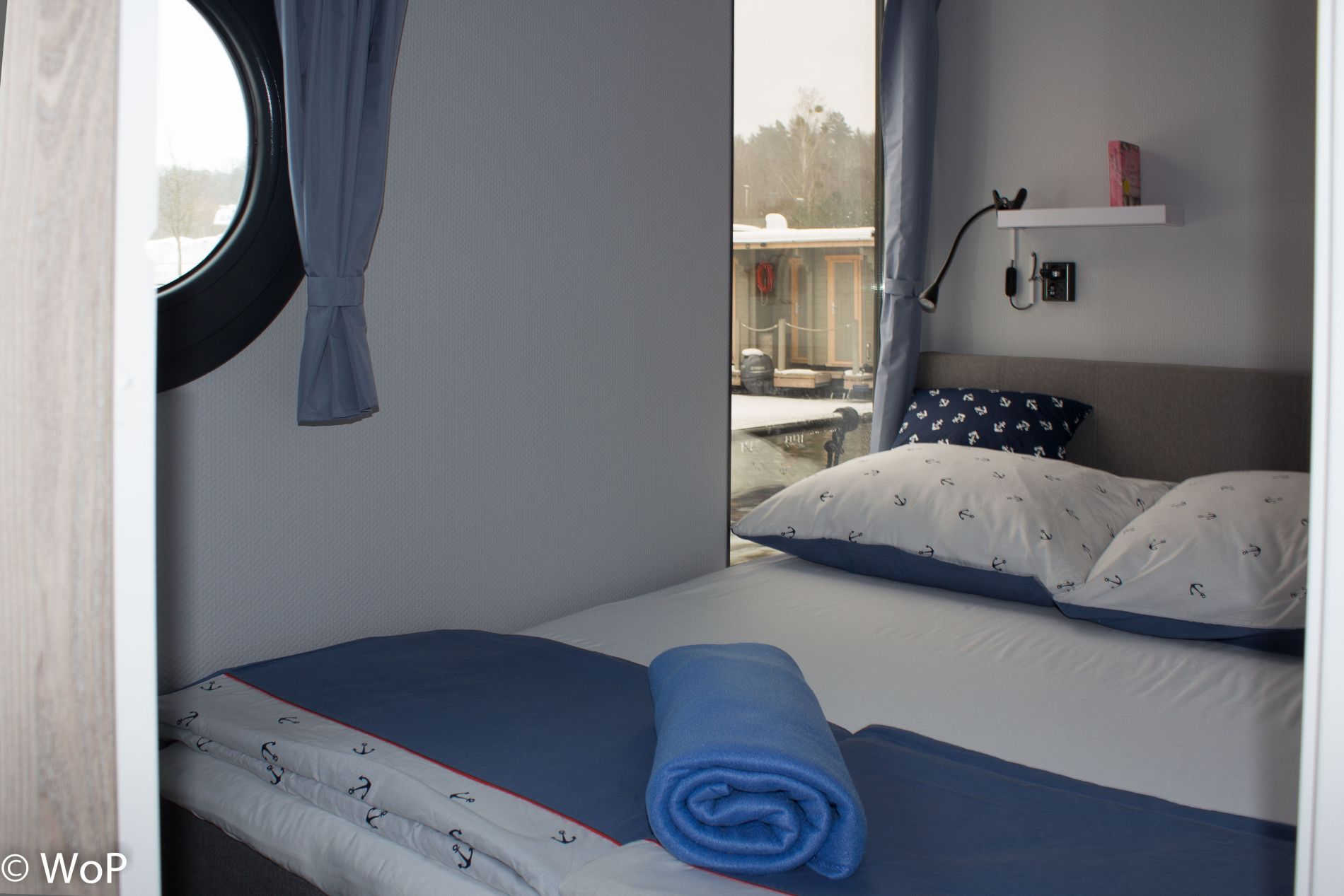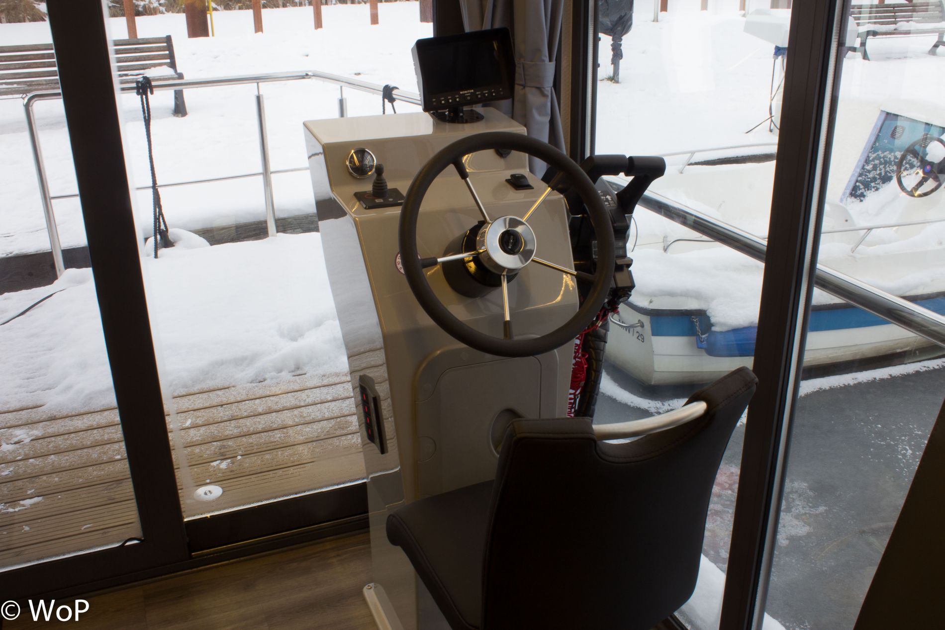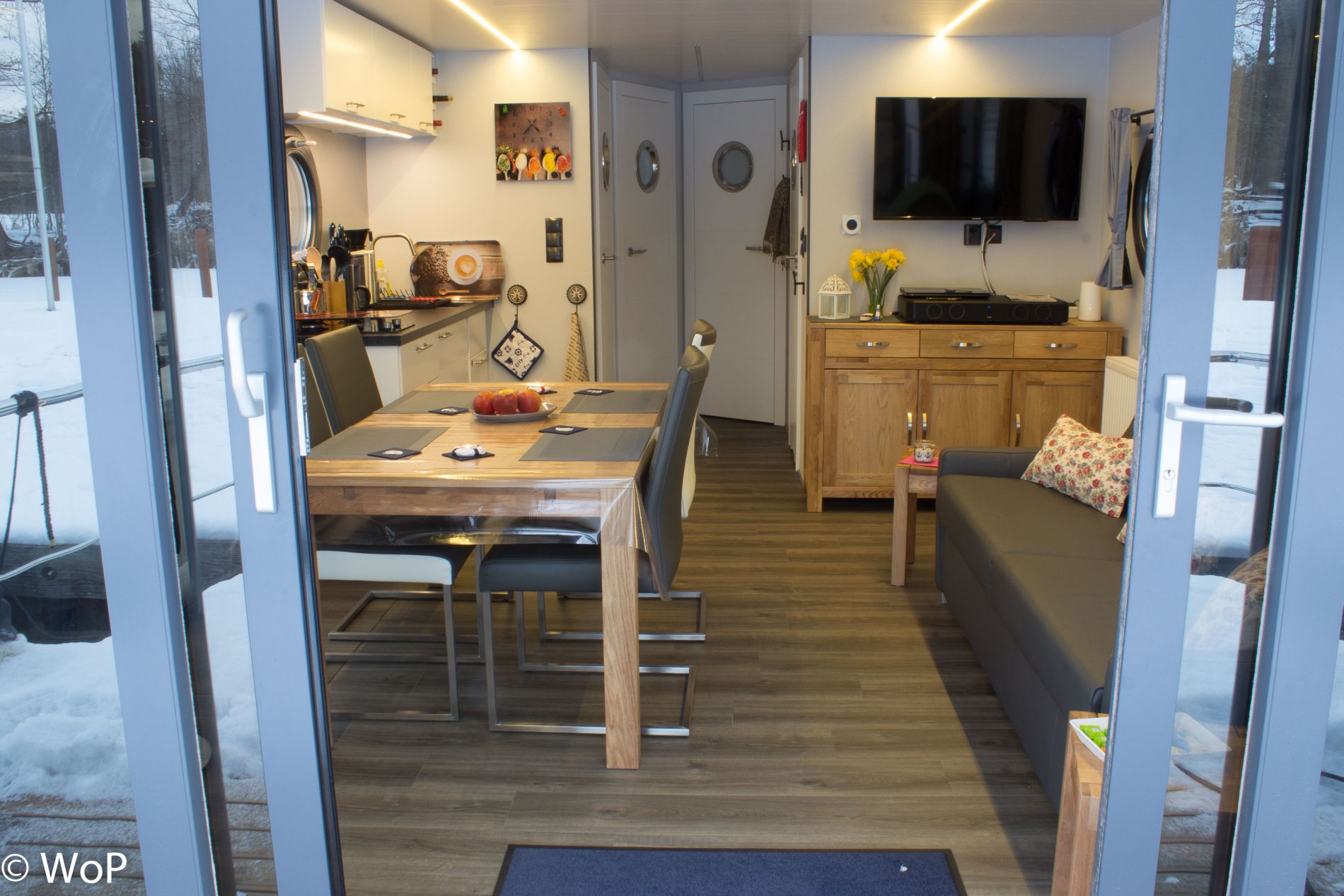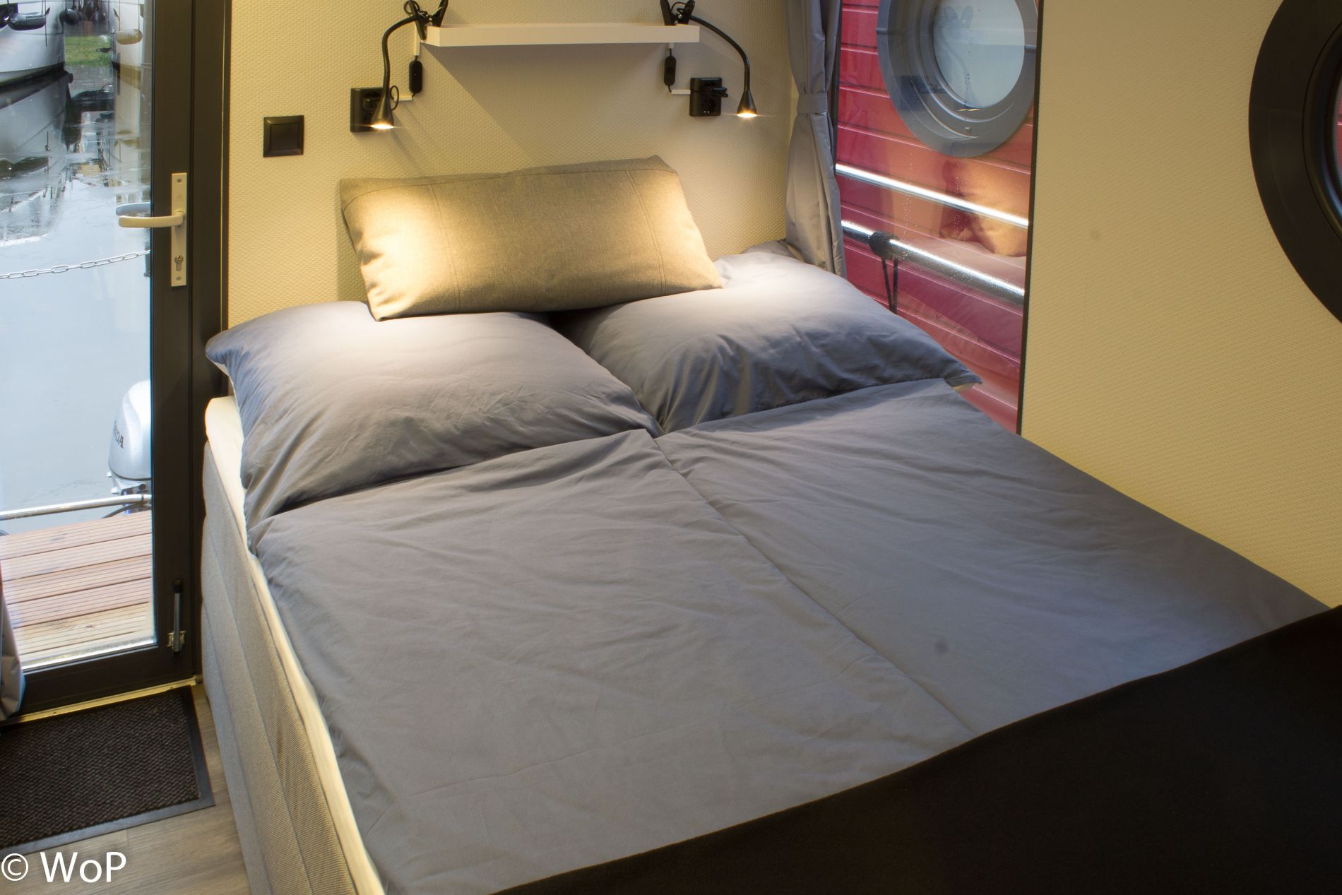 In the spacious living area you will find the helmstand with a height-adjustable chair, dining table with comfortable chairs, sofa (can be pulled out into a 1.60 m wide double bed), side tables (can also be used as stools), sideboard and kitchenette. The 1st bedroom has a box-spring double bed (1.40 m), panoramic windows and the door to the rear terrace. The 2nd bedroom has the same bed, panoramic window and porthole. Both bedrooms have wardrobes and generous storage space in the bed drawers. The bathroom is comfortably furnished with a shower, electric toilet, washbasin, porthole and electric fan, as well as a towel rail radiator. At the stern you will find another terrace with the outboard motors, the gas locker (can also be used as a bench), the bathing ladder and an outdoor shower. The bow terrace is easily accessible through the large patio doors. Garden chairs with cushions and tables are available on board.