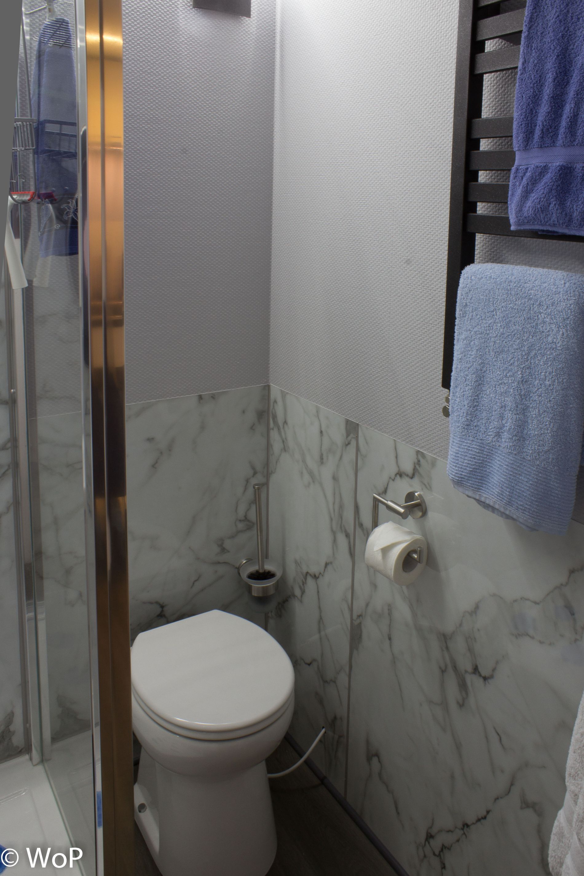 bathroom with shower, electric toilet and washbasin