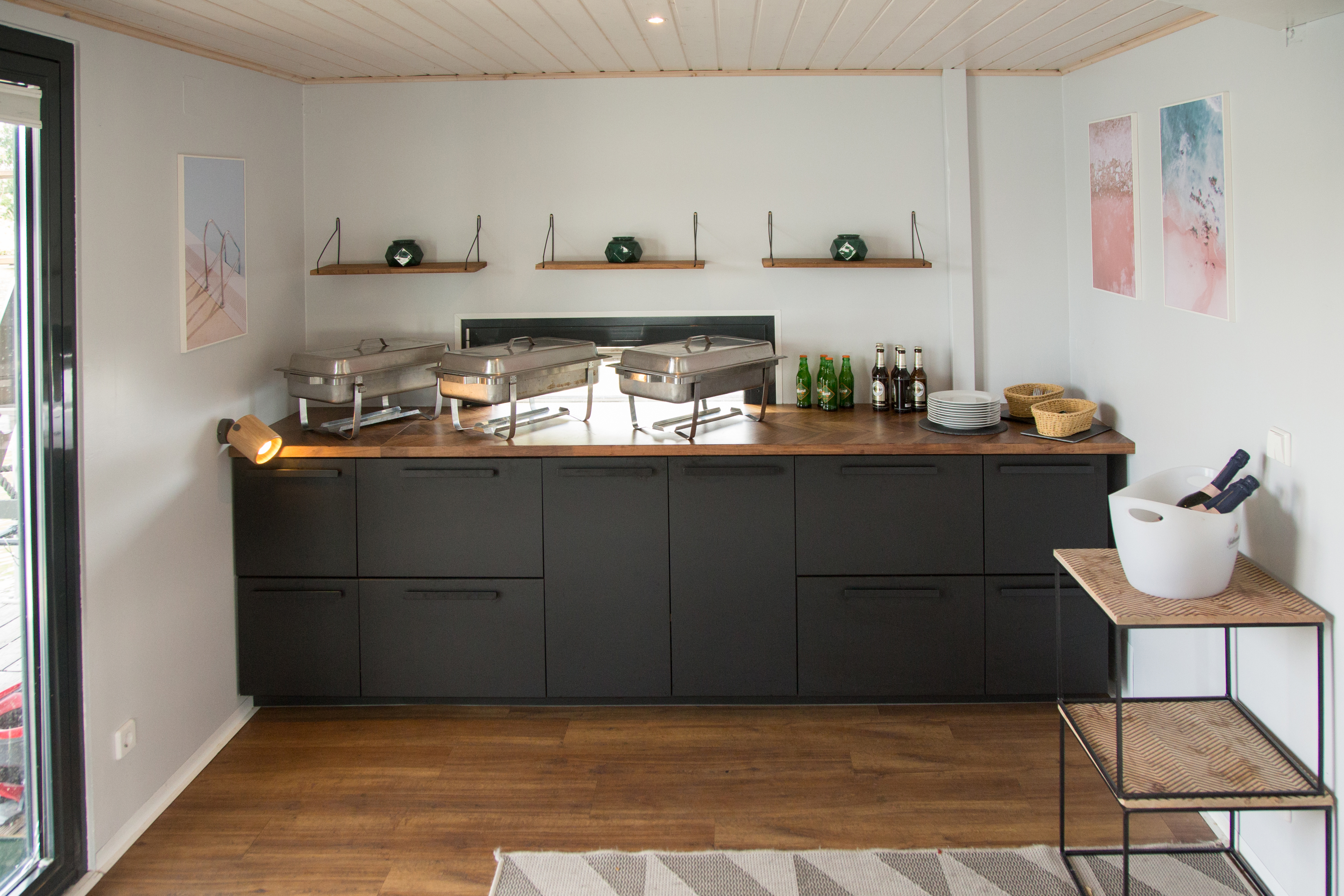 The front area is equipped with long tables and benches. The rear area of our lounge raft is perfectly equipped for food presentation, such as a BBQ with buffet.
