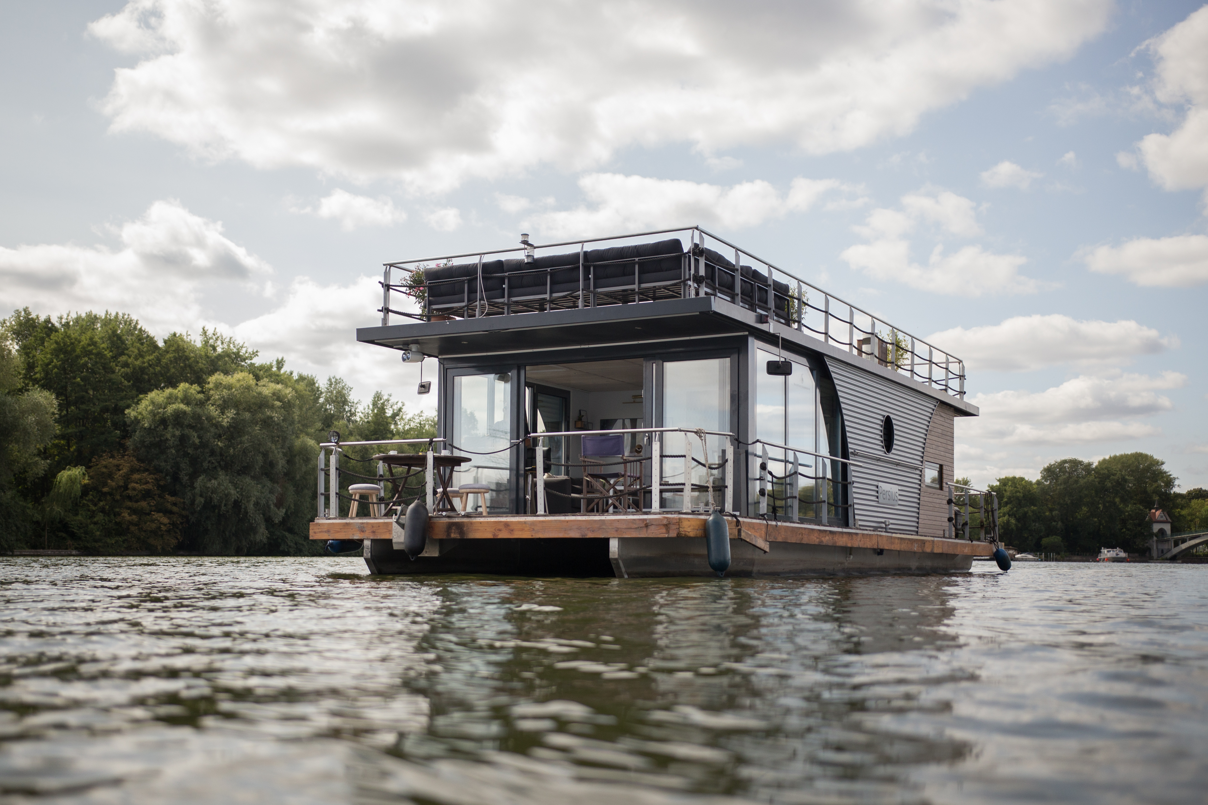 The Loungefloß I is ideal for swimming trips, friends or family celebrations as well as meetings and product presentations in a small circle and elegant ambience. The spacious interior creates ideal conditions for a social gathering with family, friends or colleagues. In addition, the large glass front allows a unique panoramic view of the water - regardless of the weather.