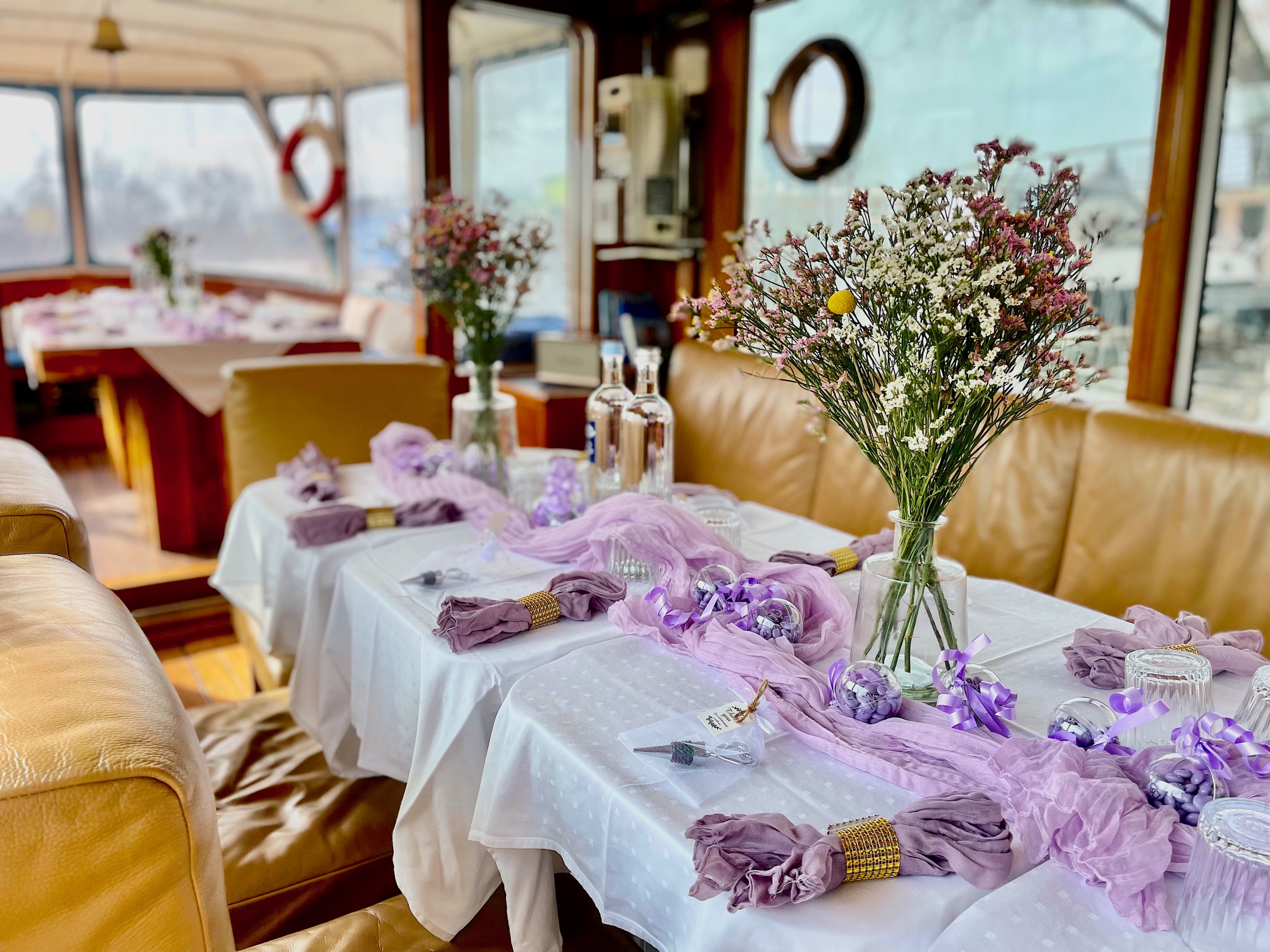 Rent Berlin's most elegant ship and let yourself and your guests be enchanted by its historical flair and modern comfort! The salon ship is ideal for unforgettable celebrations and events, exclusive city tours and day trips, for up to 28 guests (plus crew). Whether weddings, birthday parties, family celebrations, Christmas parties or corporate events – we sail in all seasons and in all weather conditions. With an on-board bar, panoramic views, leather sofas, and heating, every trip is a highlight on the water. Treat yourself to a city tour in a class of its own, a short break on Berlin's lakes, or an exclusive day trip – we'll make your day perfect!