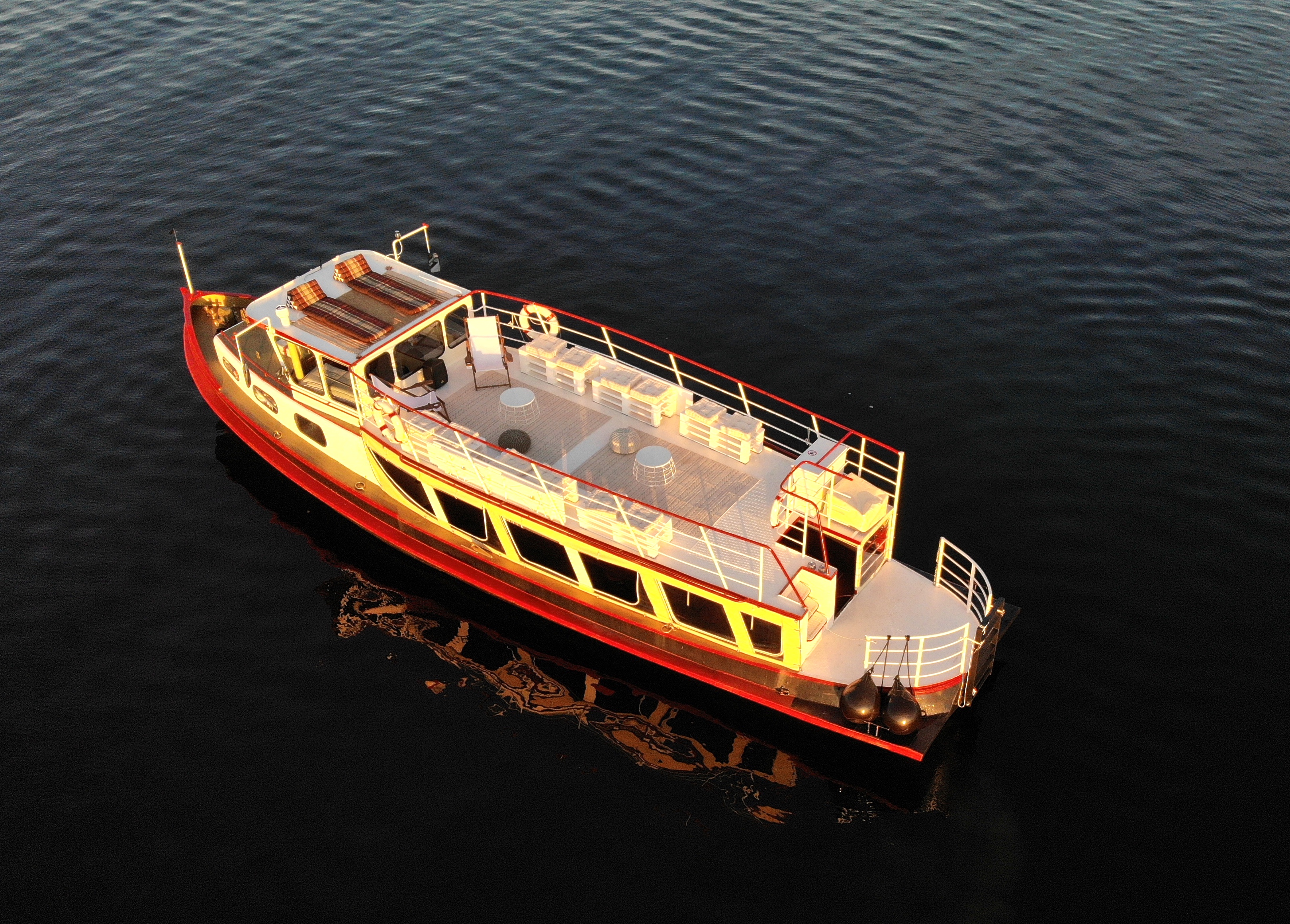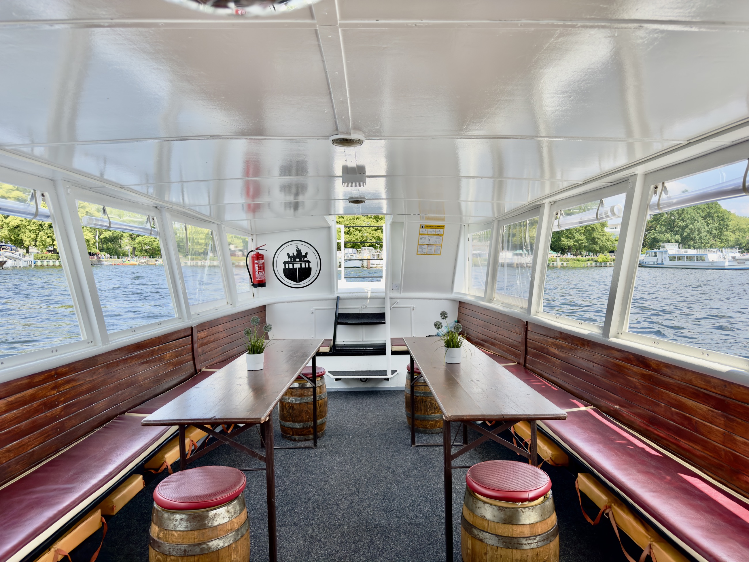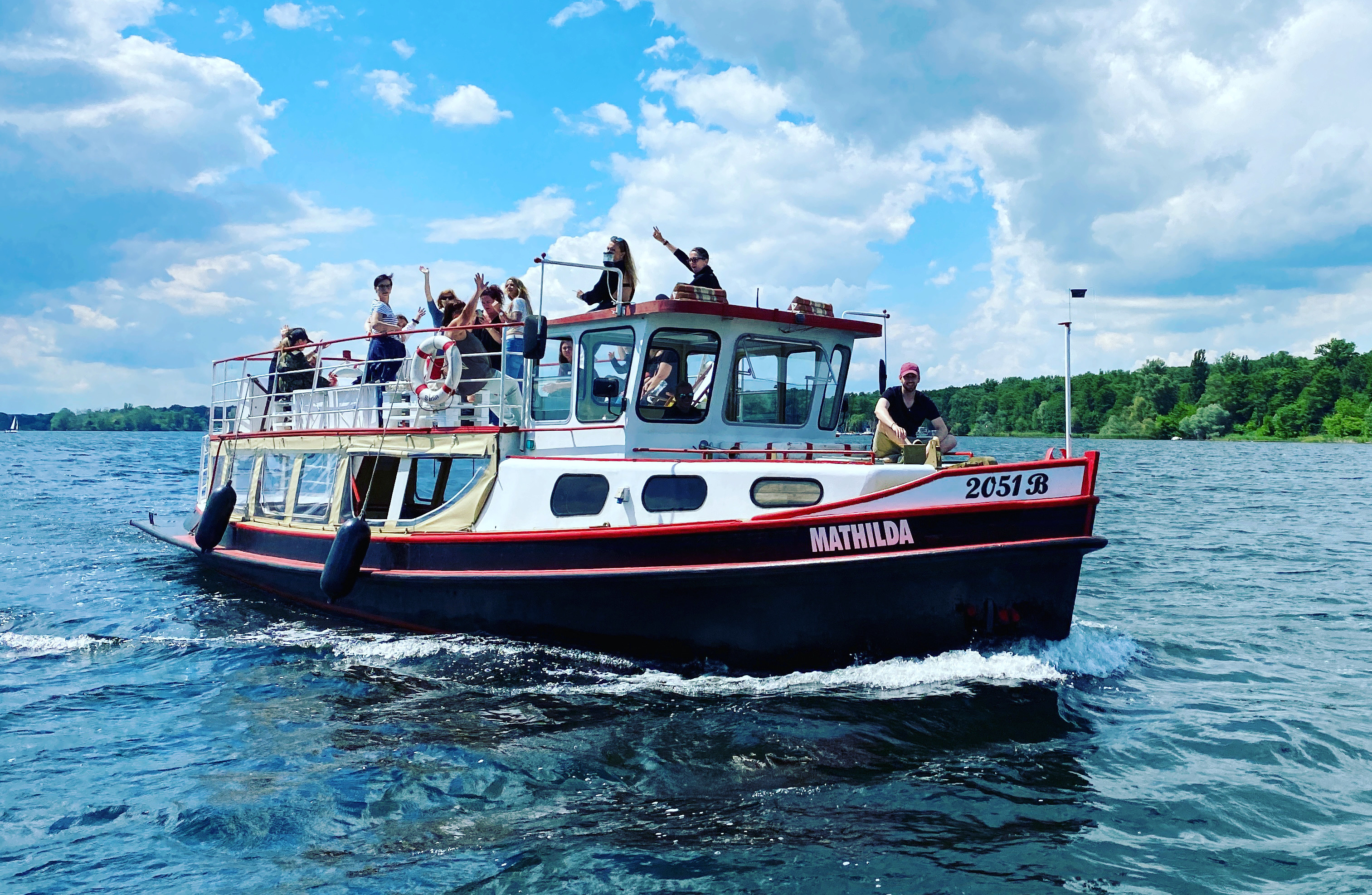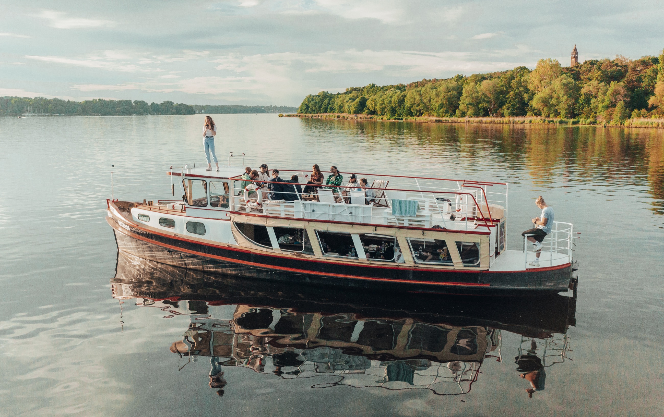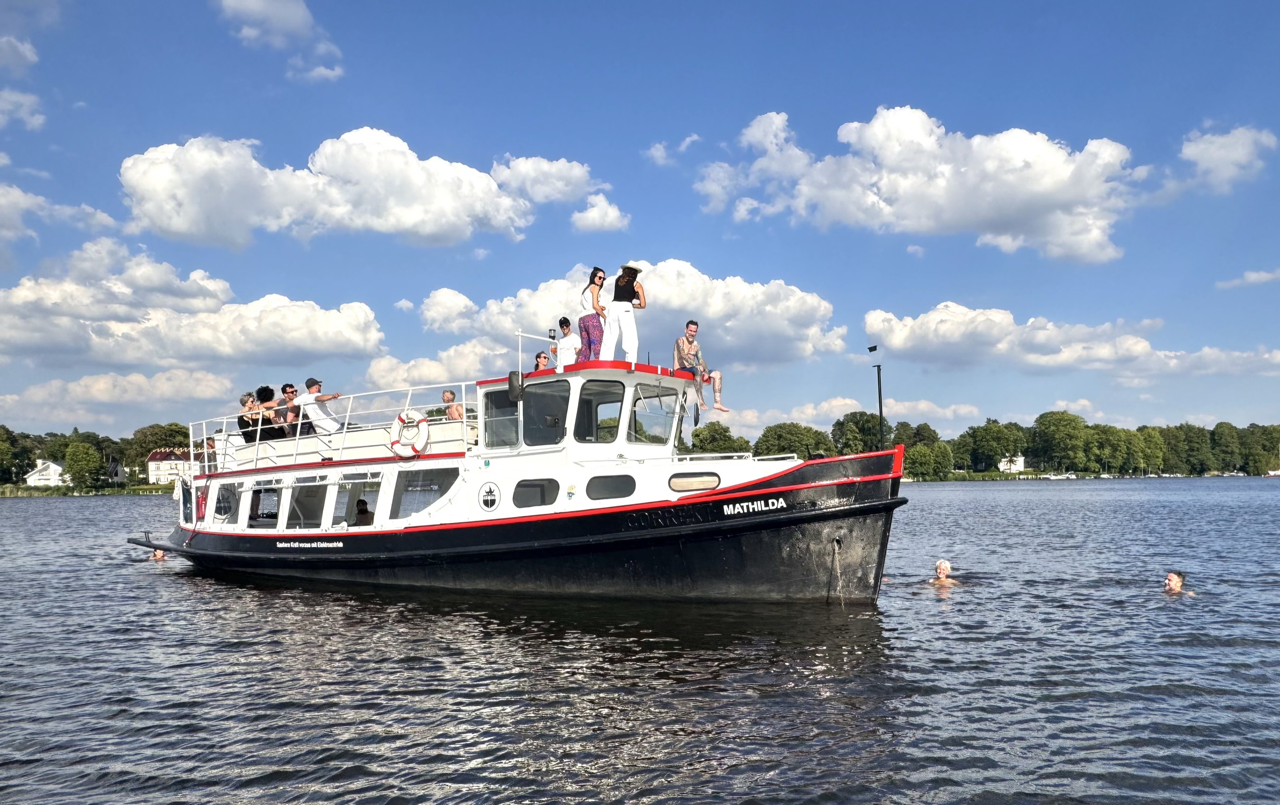 The Mathilda runs on electric power and is the perfect location for sustainable events. Enjoy an unforgettable boat trip on Lake Tegel, the Havel River or to the Berlin city centre. The Mathilda's large sun deck is equipped with benches and tables. Below deck you are 100% protected from bad weather. The windows can all be opened on hot days. The Mathilda has been one of the five most popular boats in Berlin since 2019. Of course you can also go into the water at anchor.