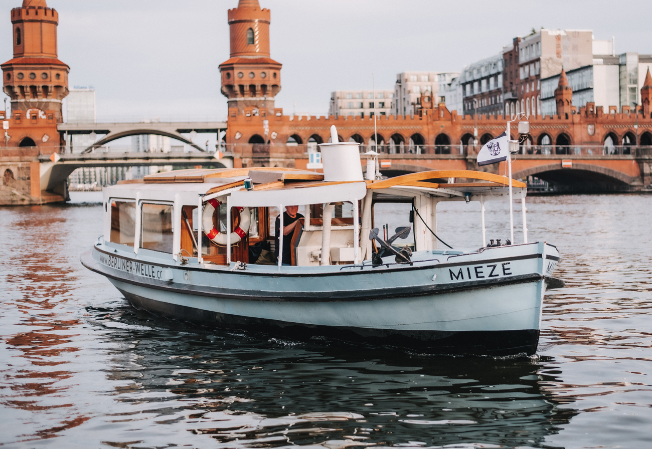 On three-hour boat tour, you will drive along the East Side Gallery, beach bars such as Kater Blau and Badeschiff, the Oberbaum Bridge and the districts of Kreuzberg and Friedrichshain. Of course you can also book longer tours to the city center.