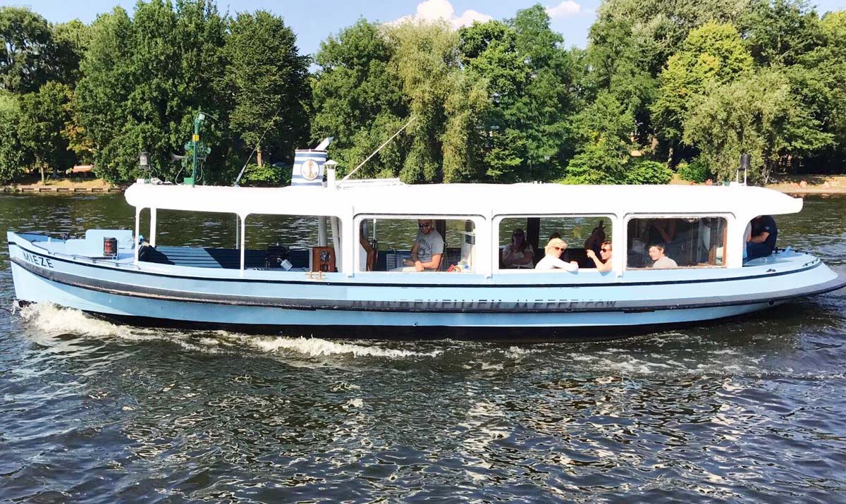 The Mieze is ideal for boat tours with up to 20 people. The boat has an environmentally friendly and quiet electric motor. The roof of the boat protects you from wind and weather in every season. The historic salon has also proven itself as a dance floor. The boat can drive into the inner city of Berlin and is a great choice for birthdays and parties.