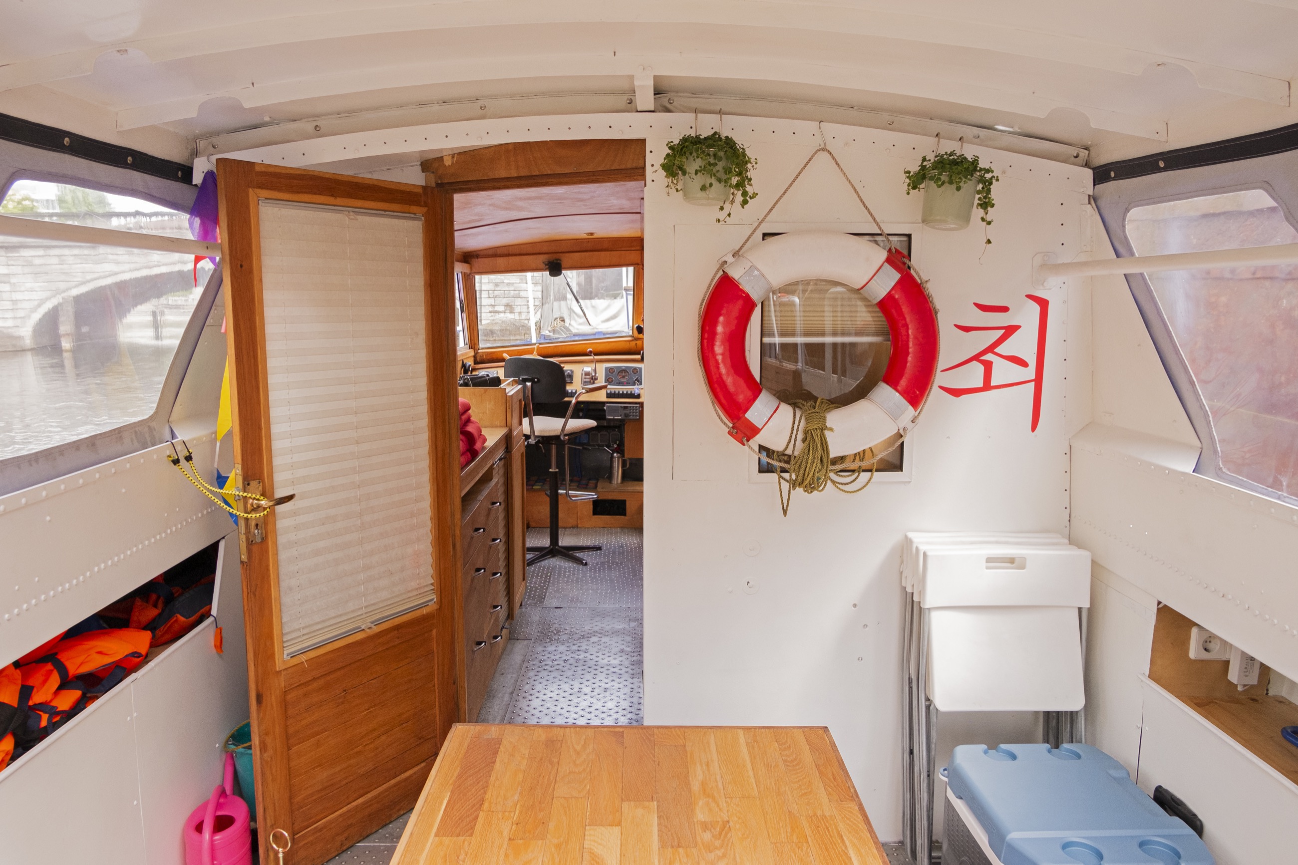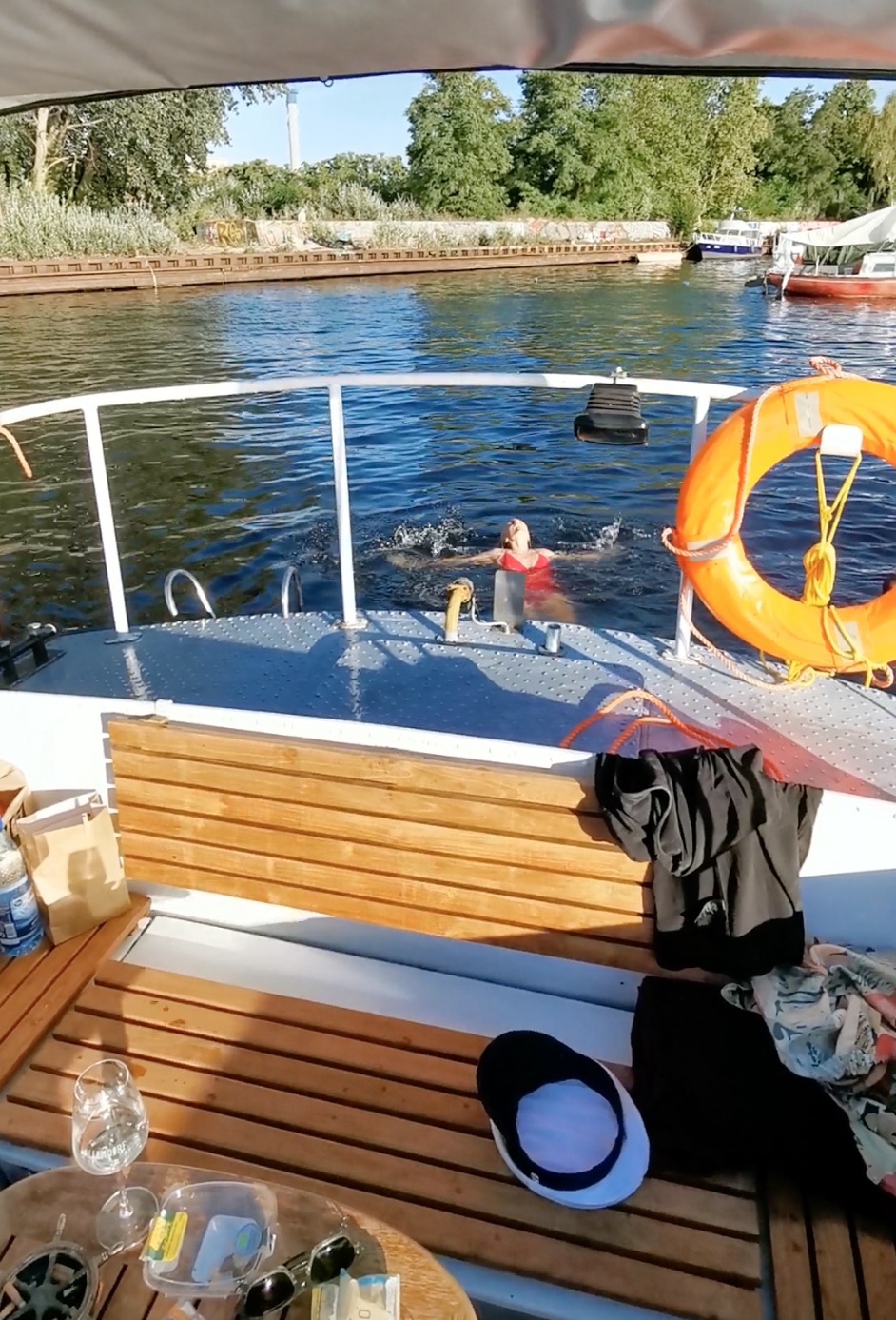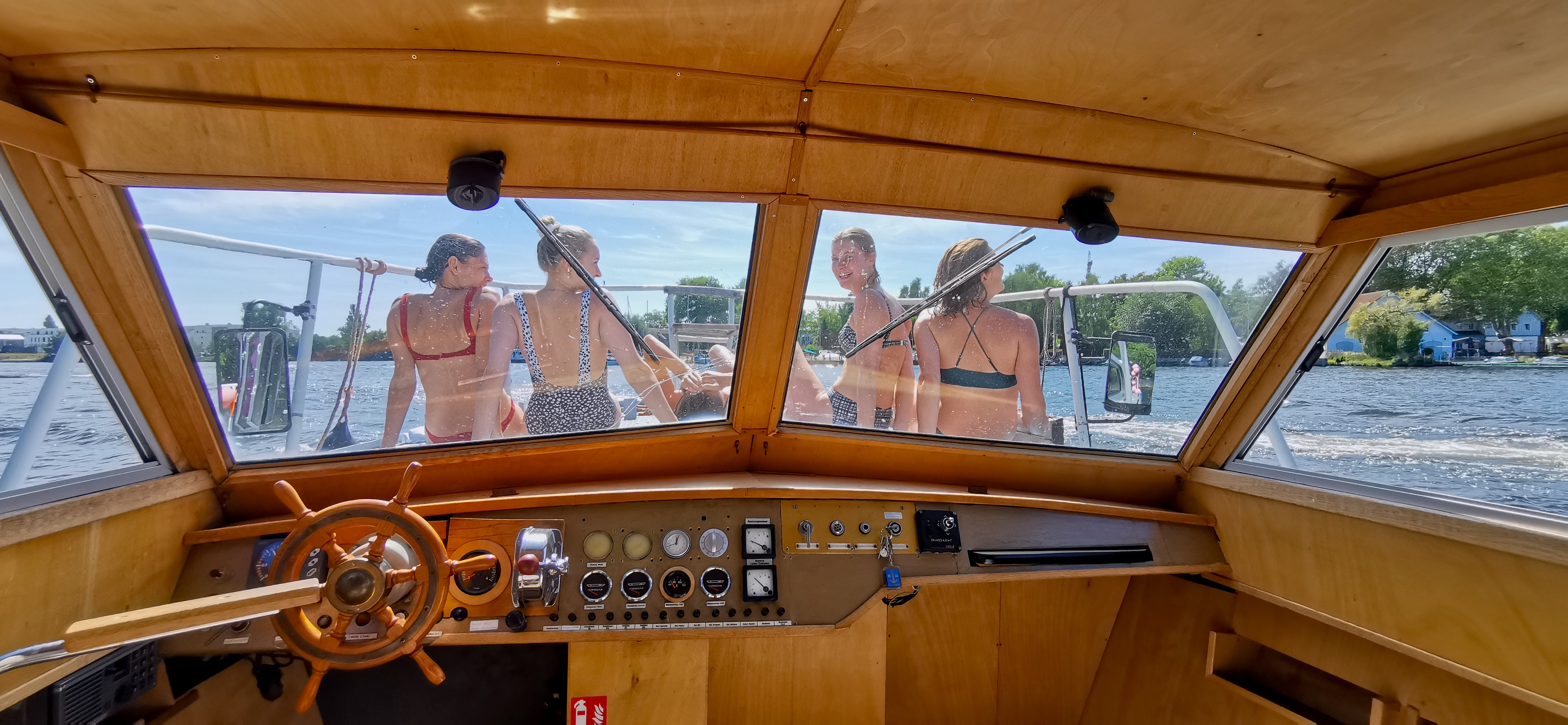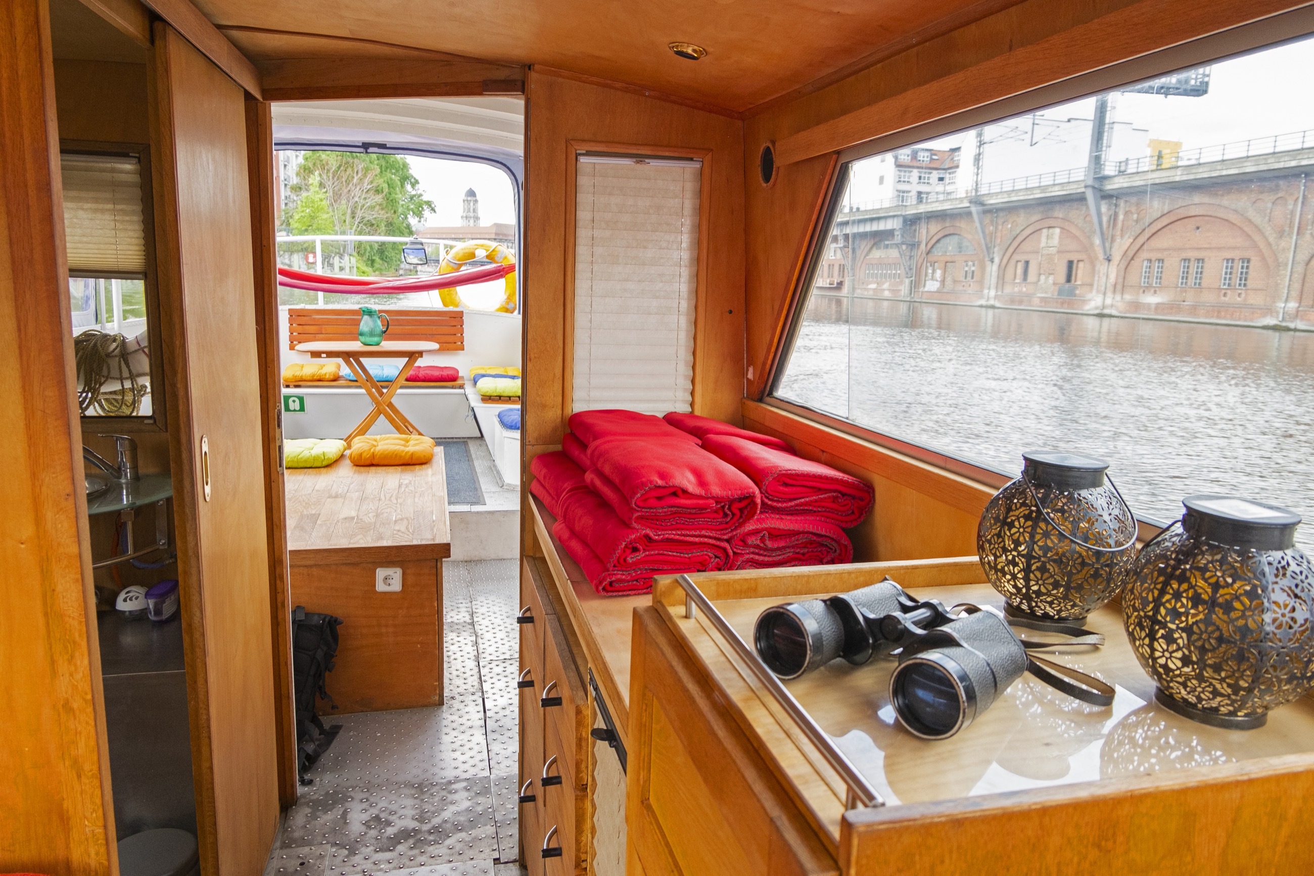 Come on board of a truly historic ship from the late days of the GDR. The nicely redesigned former control boat has a roof deck and a seating area in the back, which is protected from sun and rain, as well as an indoor area. Plenty of space for up to 11 people.