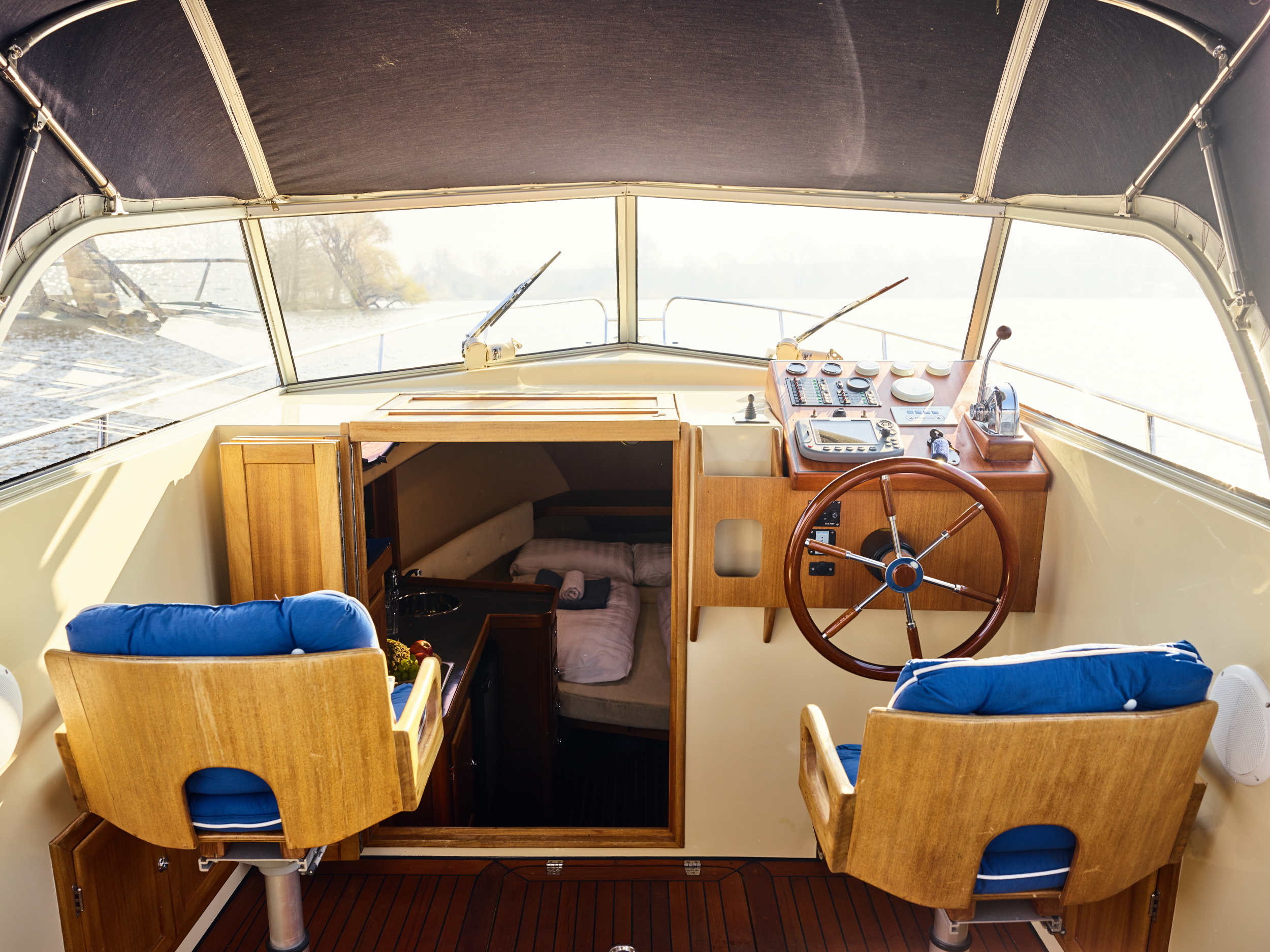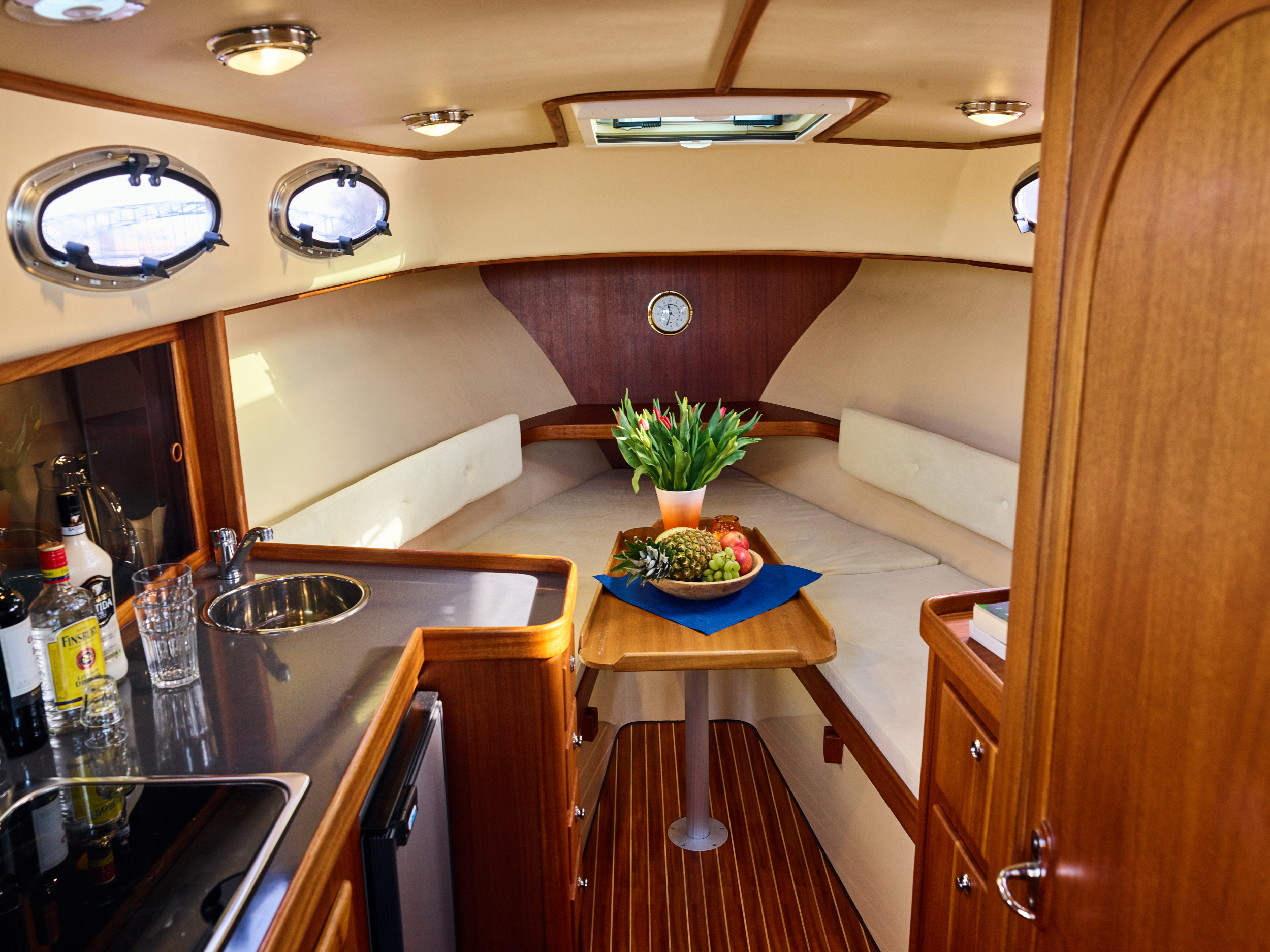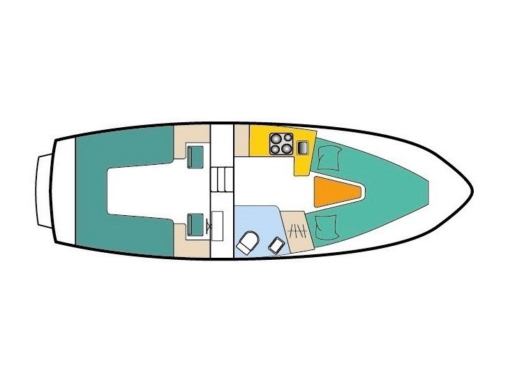 The Passion Sun 850 is just the right touring boat for two people. There is a large double bed in the foredeck. The boat has a very large kitchen and a sanitary room with an electric toilet and an indoor shower. The boat is also equipped with a bow thruster and an outside shower on the bathing platform.