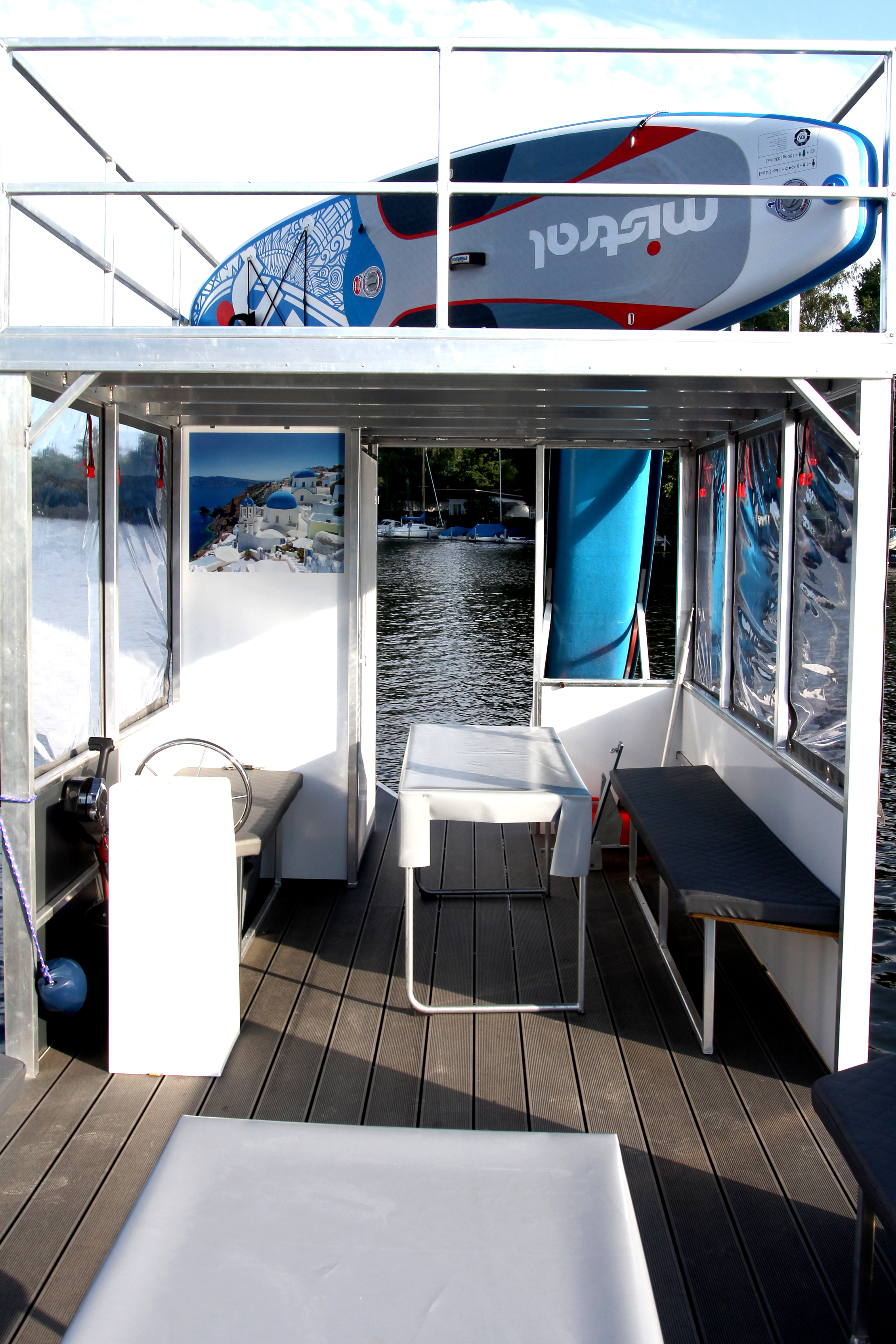 Rent a raft for your whole family in Berlin and drive to the Tegel Lake. The handling is quite simple and quick to learn. The raft has a weatherproof cabin and a Weber gas grill. The roof is walkable and equipped with a slide. Your kids will love it.