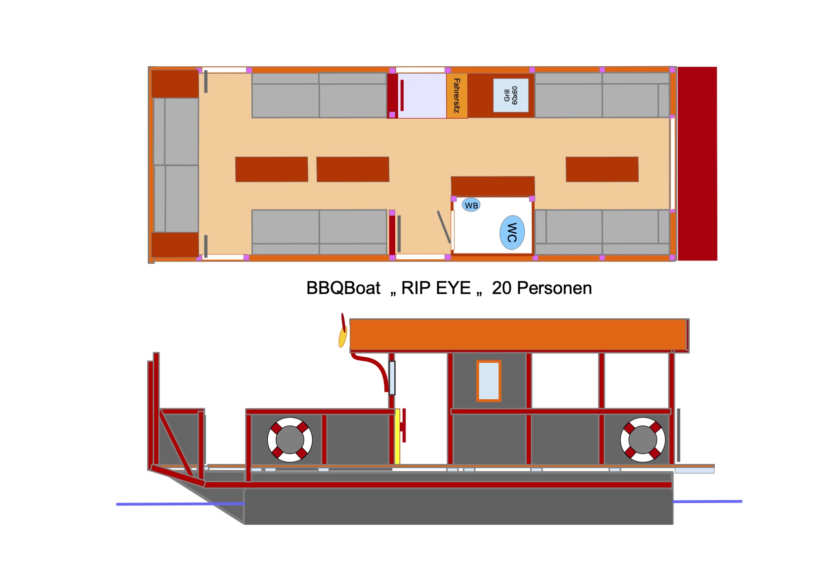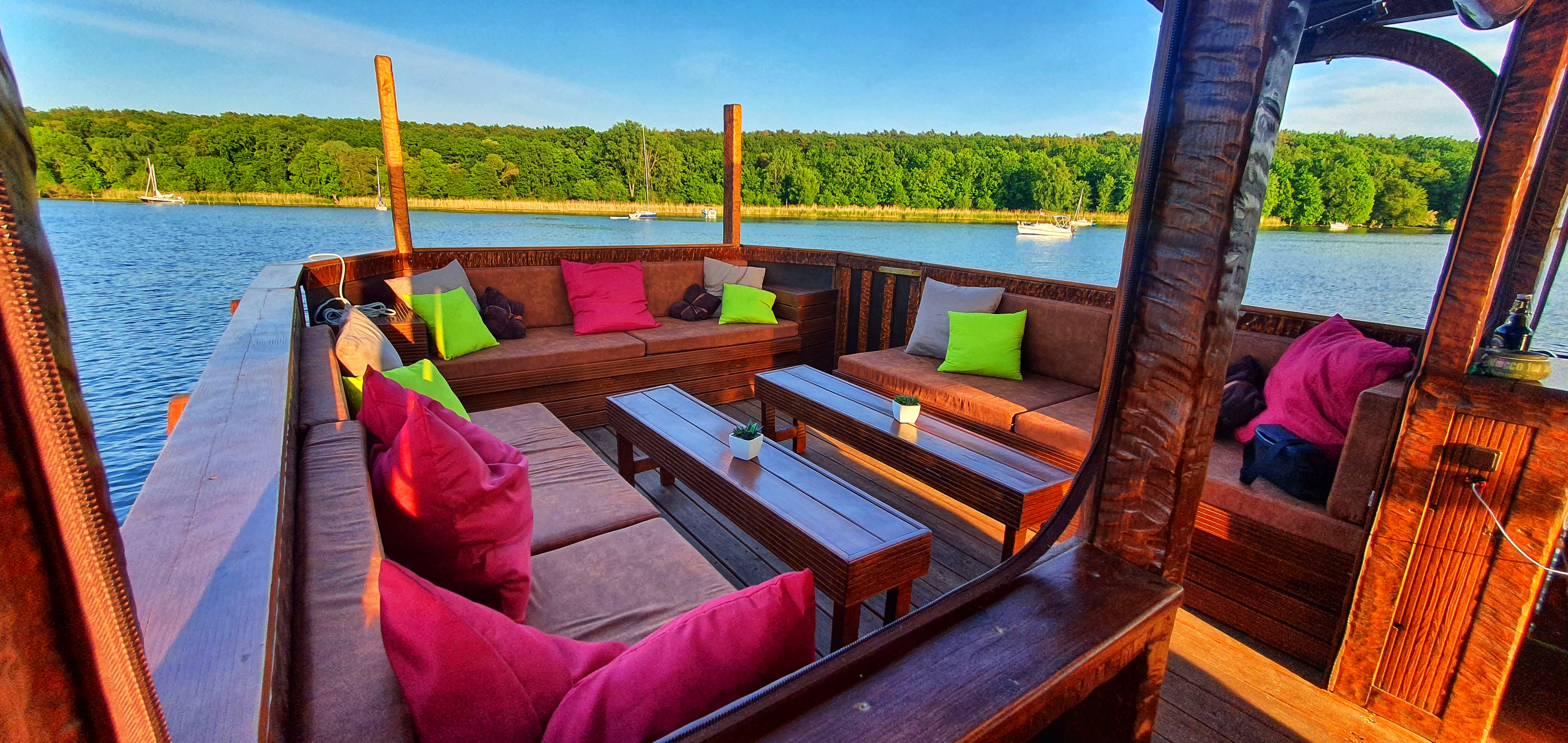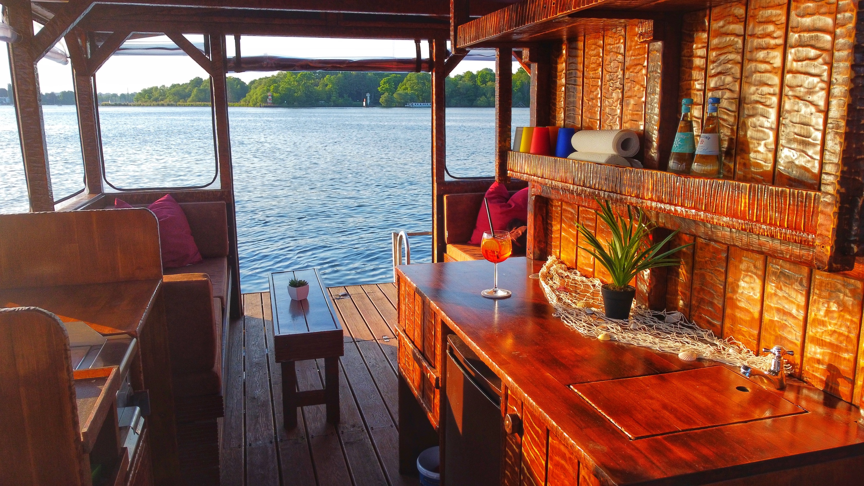 On request, the grill raft can also be booked with catering. The home port of the Rib-Eye is the pier of the restaurant "Alte Liebe" just behind the Berlin Olympic Stadium. Depending on the rental period and bathing breaks, the raft tour leads across the Havel in the direction of Grunewald, Wannsee, Pfaueninsel and Potsdam.