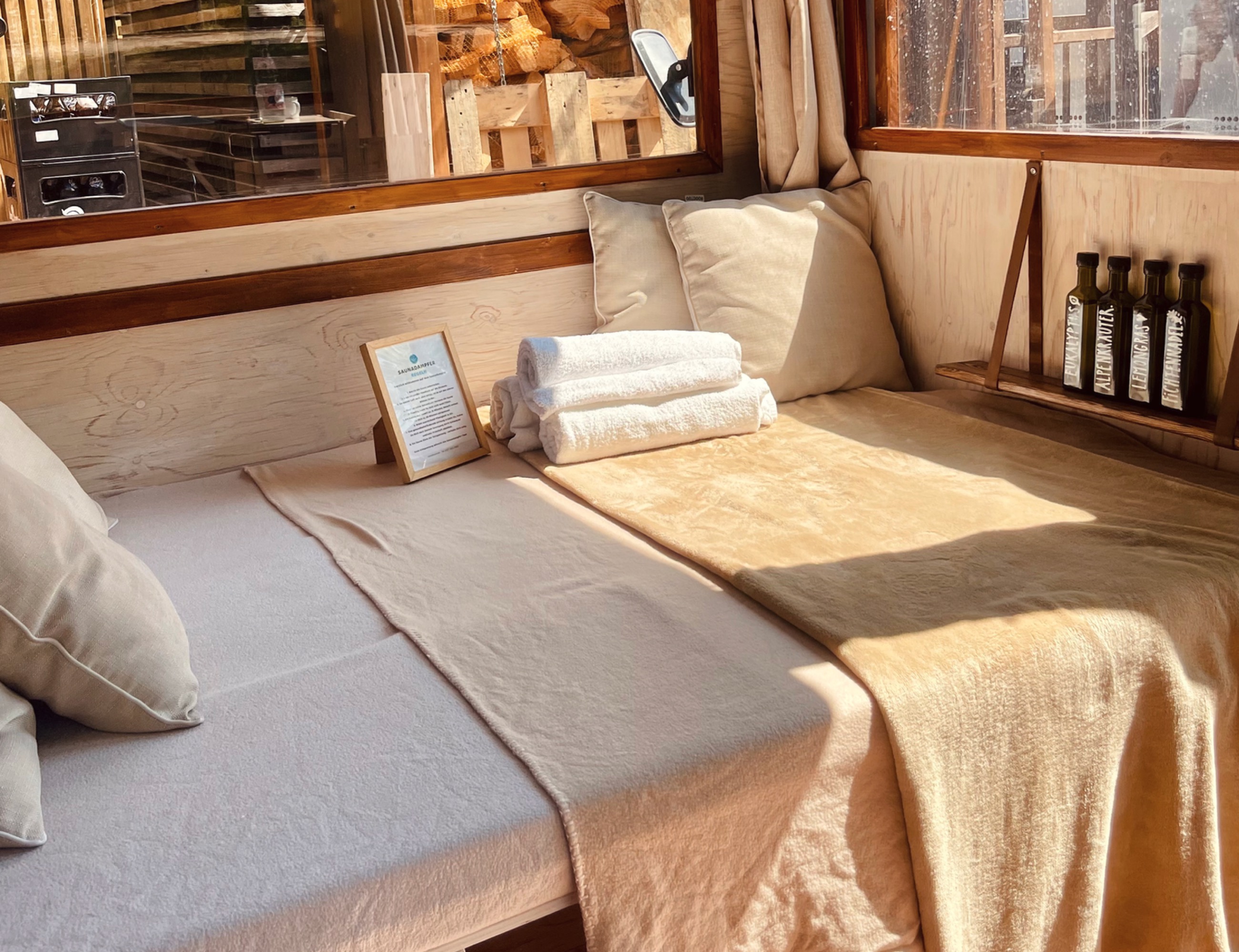 The sauna steamer consists of a sauna cabin and a winter garden for relaxing between sauna sessions. The sauna is already preheated when you arrive. Temperatures between 60 and 100 degrees Celsius are possible. Thanks to a bathing ladder, you can cool off in the river. A cold fresh water shower is also on board.