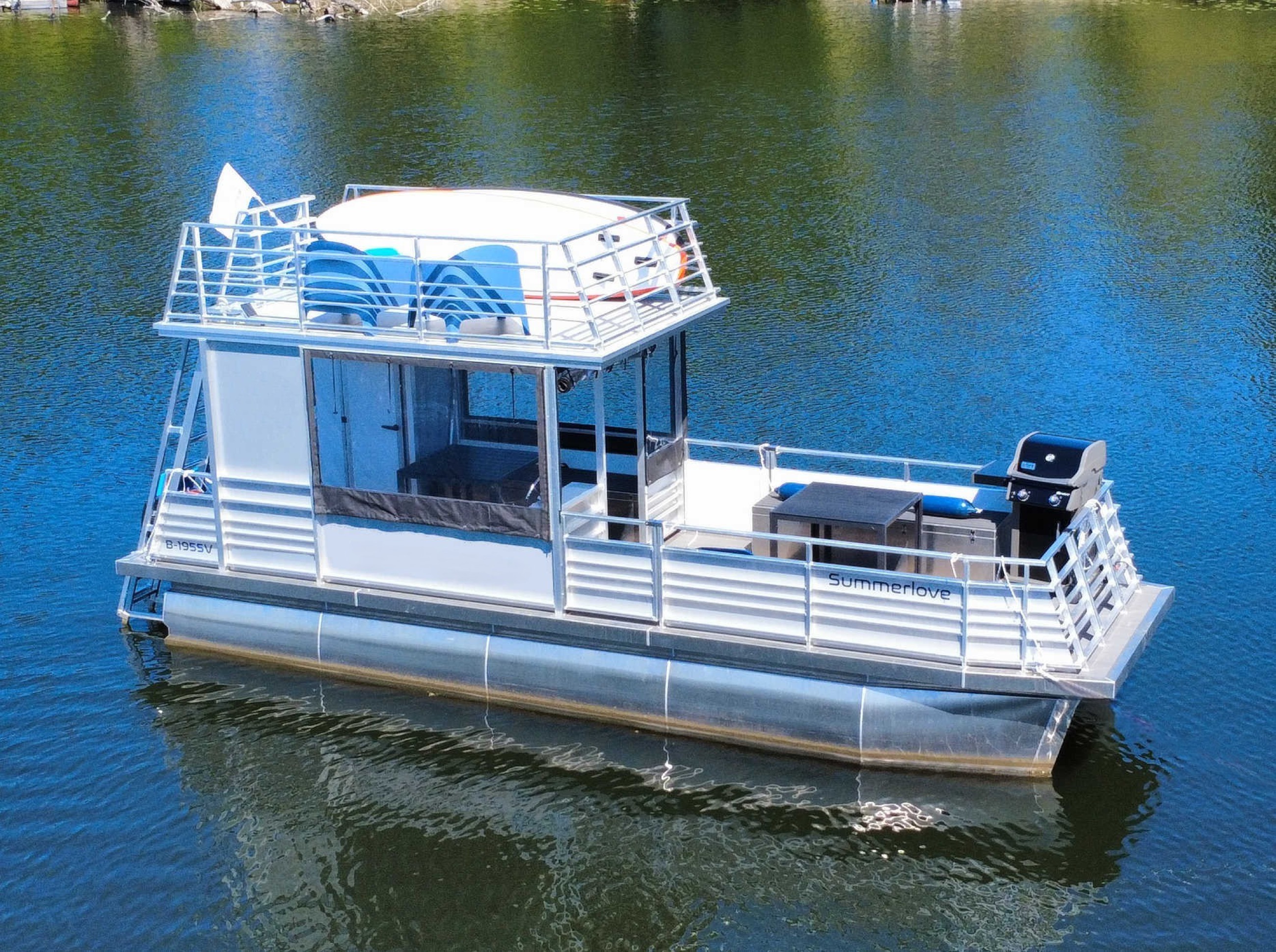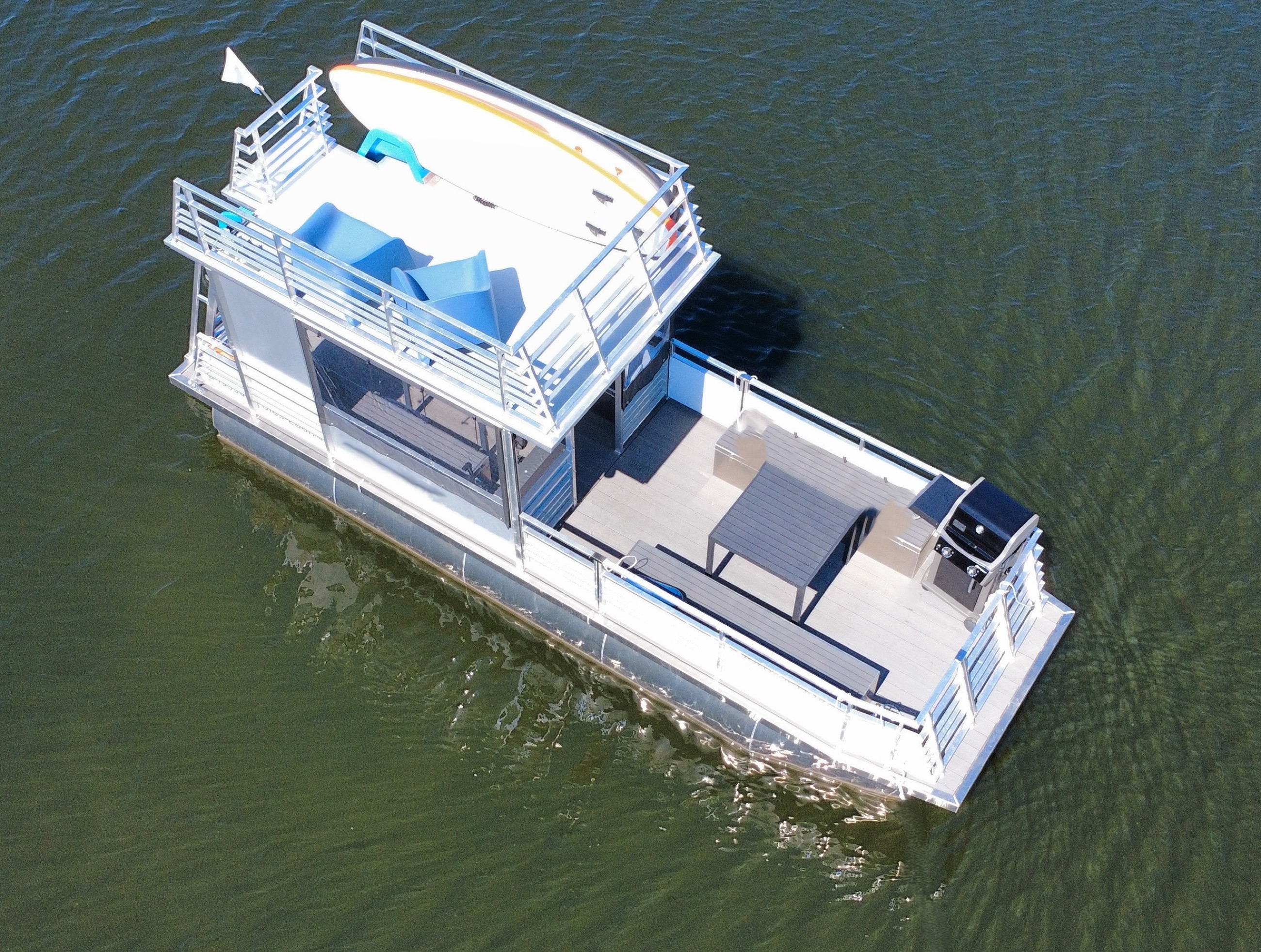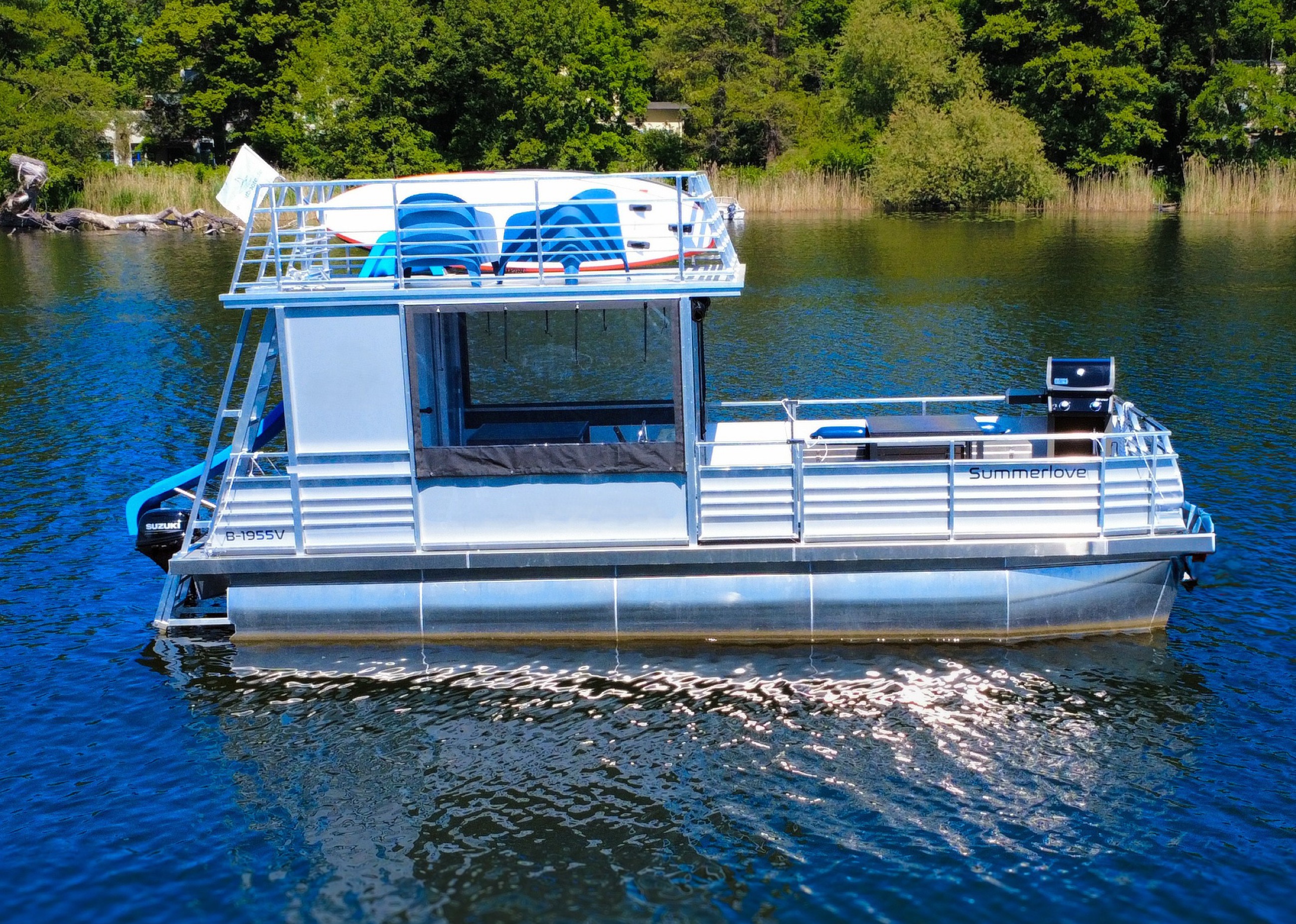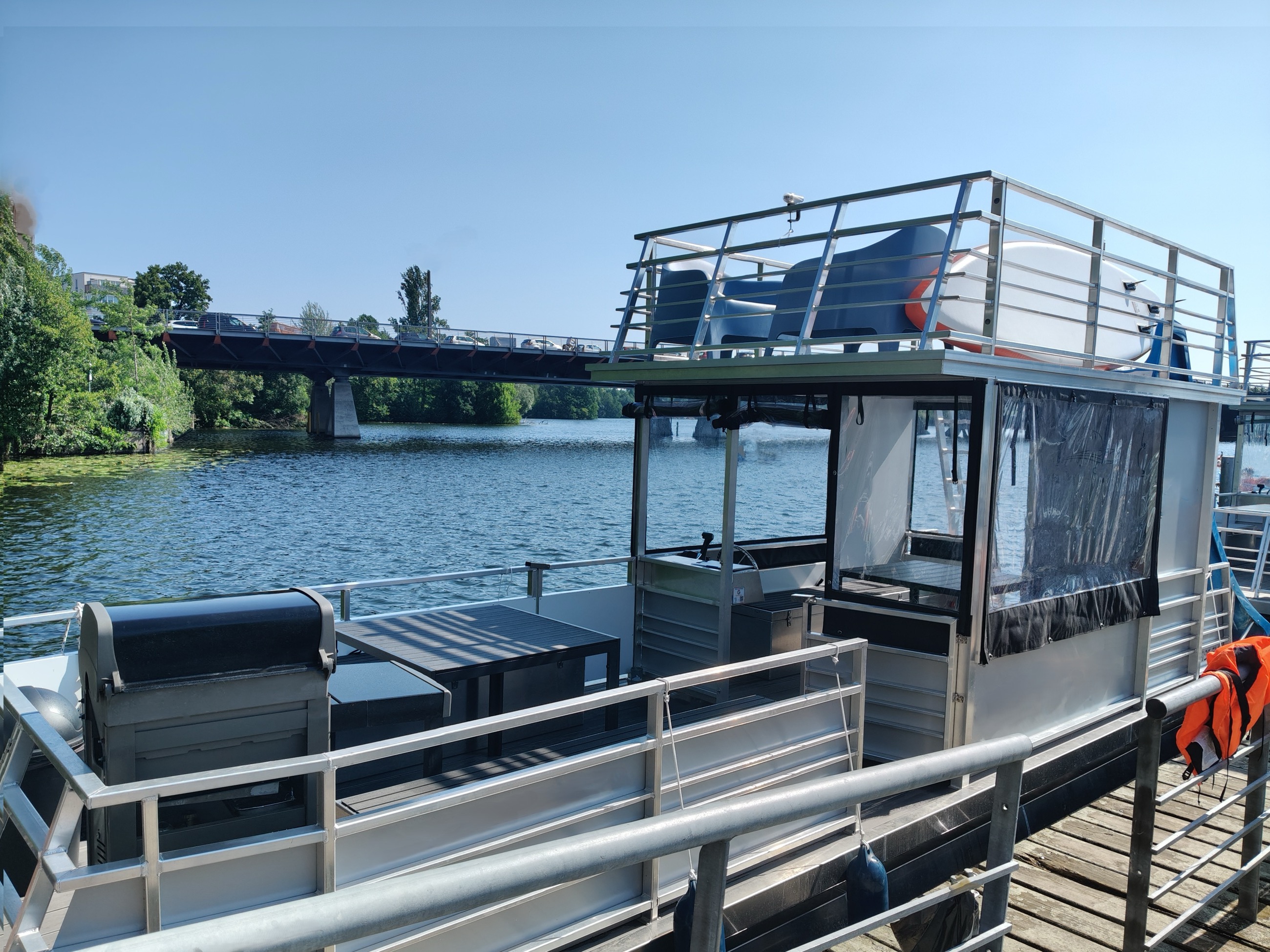 Looking to rent a party raft in Berlin for a relaxed day on the water? The grill & swim raft “Summer Love” is perfect for up to 12 people—featuring a swim ladder, sun loungers, and comfortable lounge seating. The starting point is Berlin Spandau— from here you can cruise towards Tegeler See with its clear bays and beautiful spots to drop anchor.