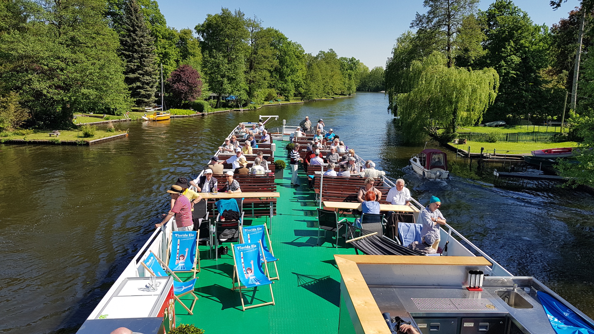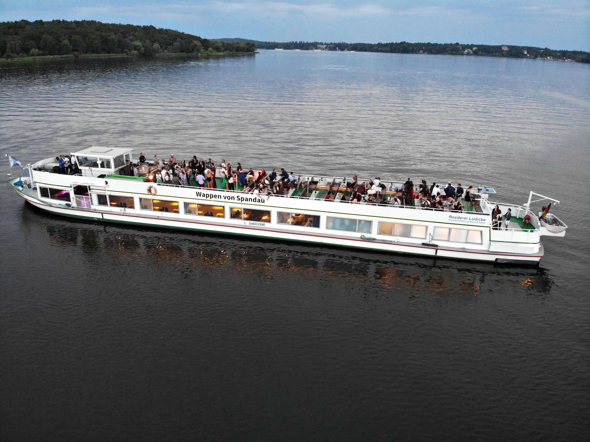 The ship impresses with its generous space relationships both in the salon (below deck) and on the upper deck. More than 250 outdoor seats allow the passengers to enjoy the legendary "Berliner Luft" (air of Berlin) on a city tour through the capital. There are 152 seats in the salon below deck and still plenty of space for the dance floor and buffet.
