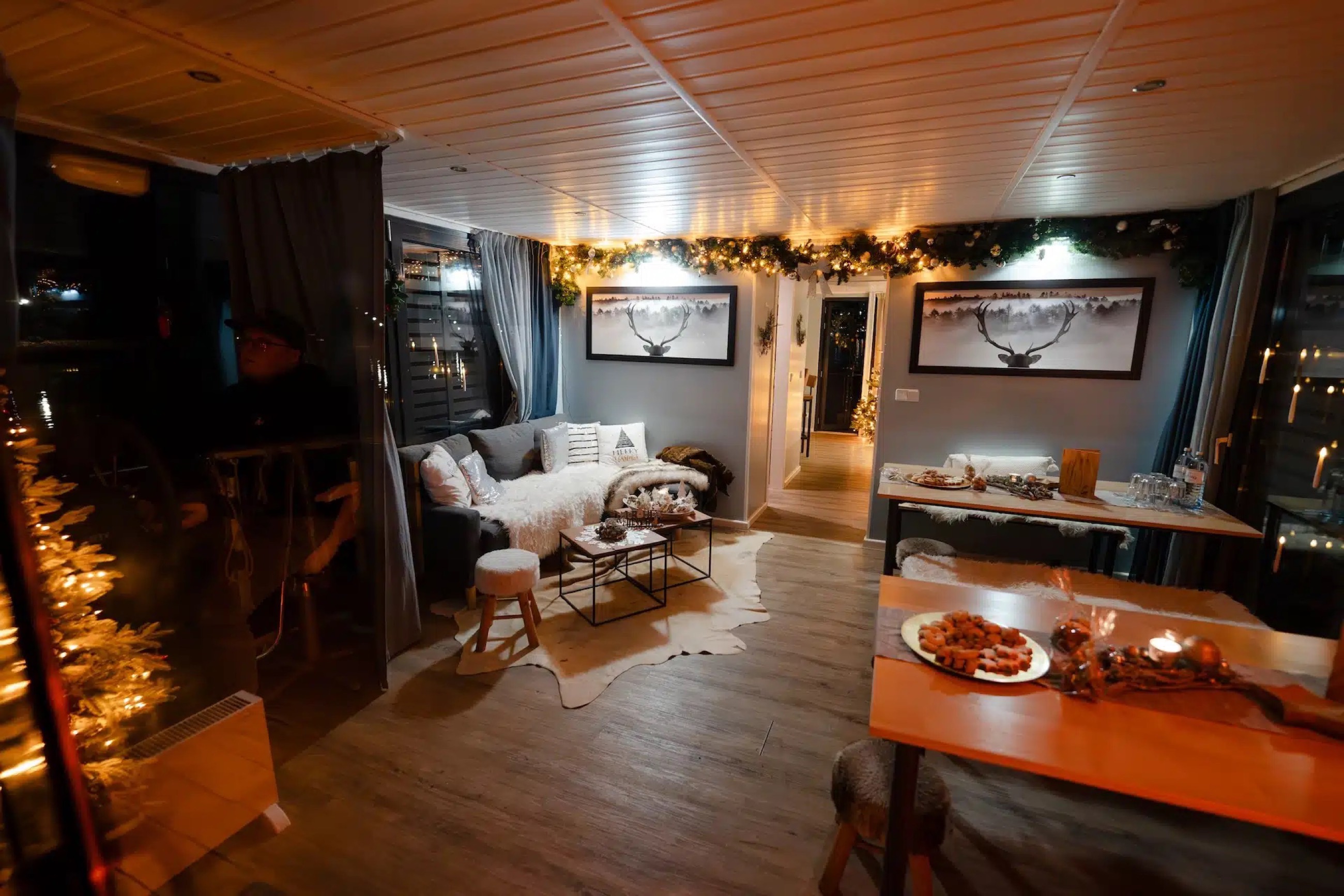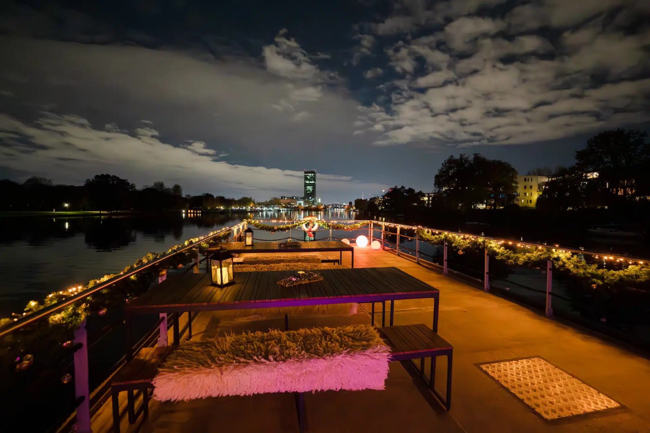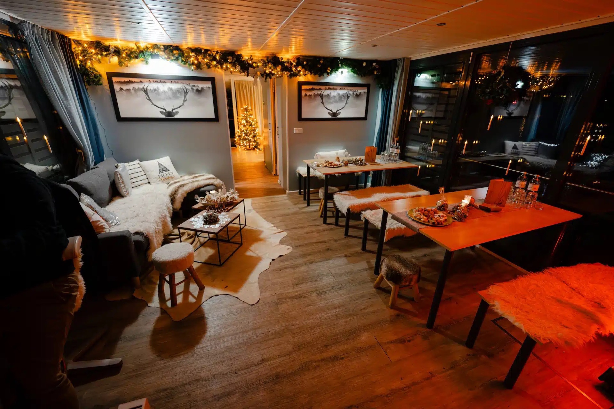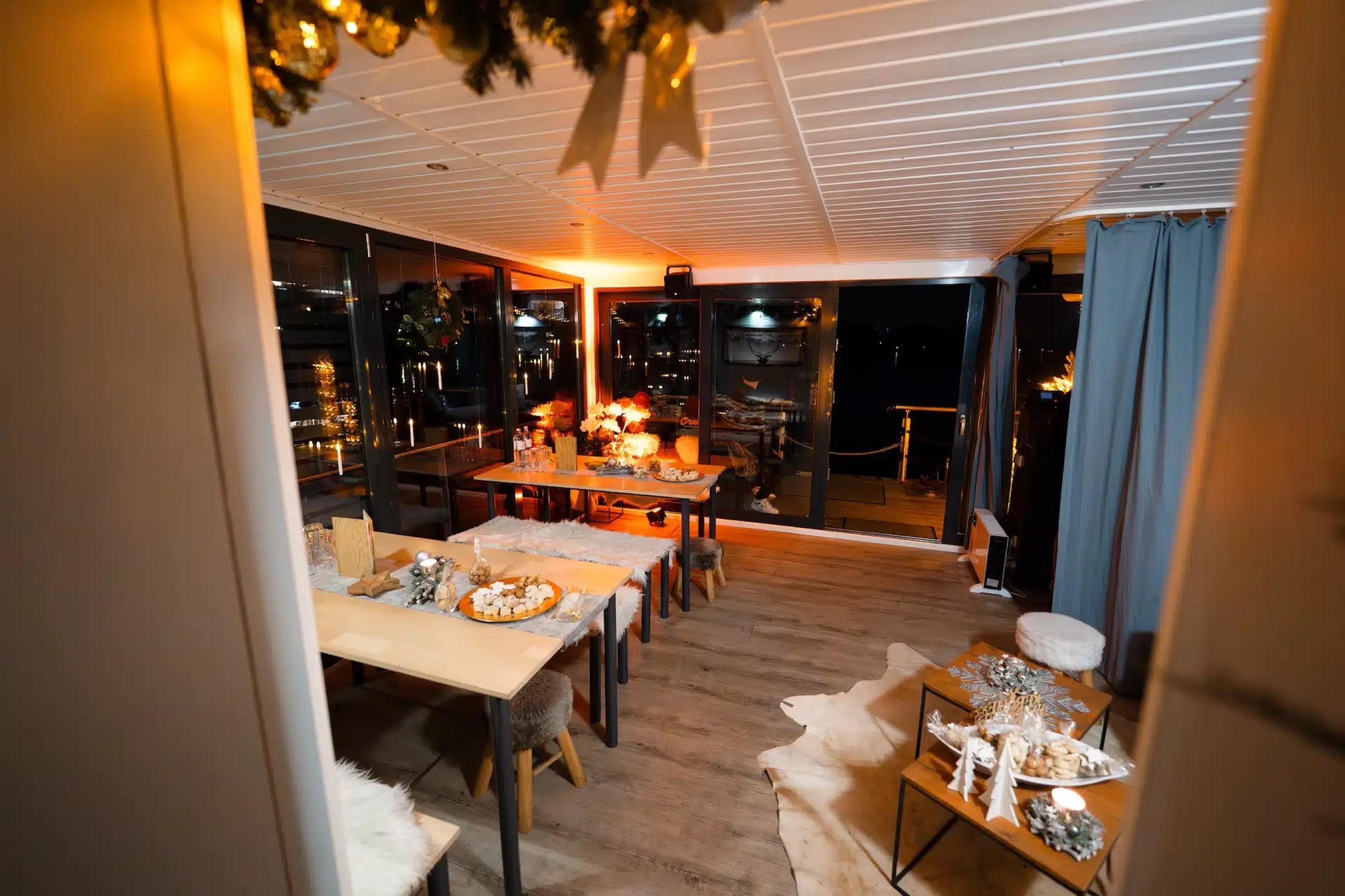 As the temperatures drop, our lounge raft transforms into the cozy Winter Lounge I. From November to February, you’ll enjoy a beautifully decorated winter setting on board, with underfloor and electric heating providing a warm atmosphere – all while cruising along the scenic winter Spree.
