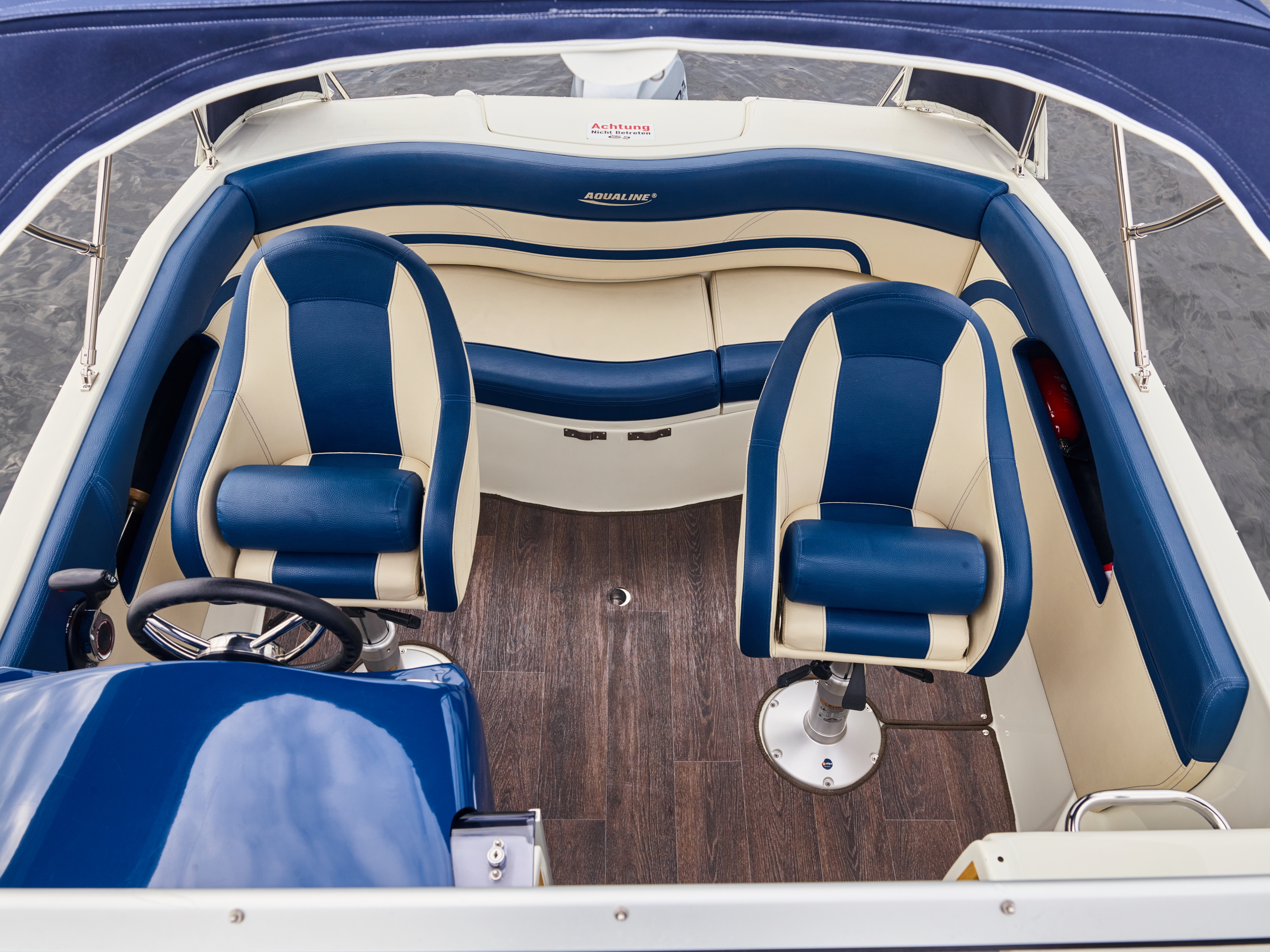 The cockpit features a comfortable couch and two driver seats.