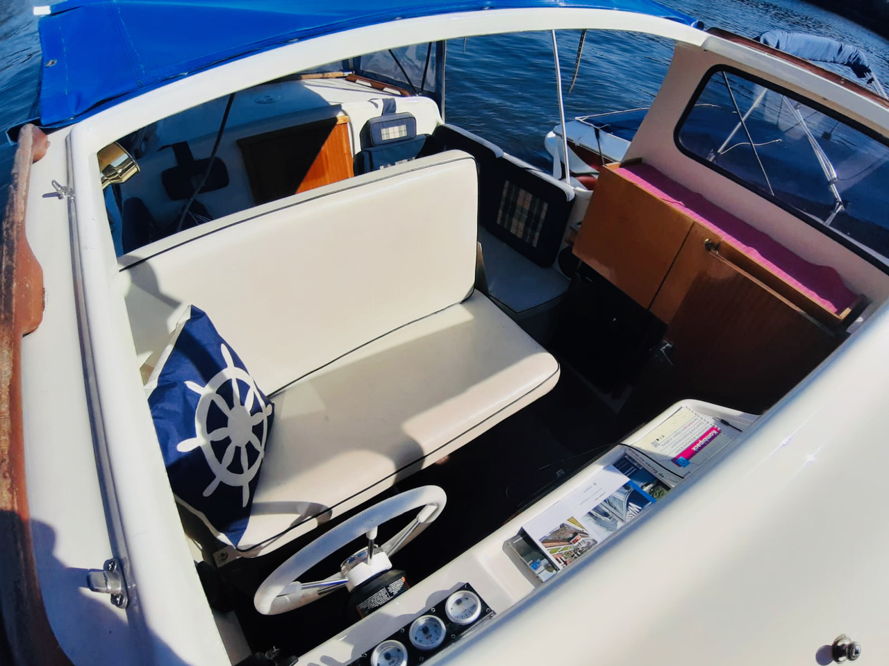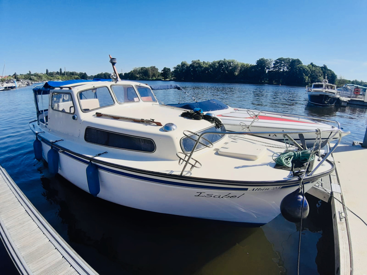 Das Hausboot Albin 25 de Luxe namens "Isabel" ist bestens für Anfänger geeignet. Nach einem optionalen Skippertraining fühlt sich der Skipper am Steuerstand heimisch. In der getrennten Achterkajüte befinden sich zwei Betten mit je 190 cm Länge und einer Breite von 70 cm. Im Salon ist die Sitzecke zum V-Bett mit einer Länge von 190 cm und einer Breite von bis zu 195 cm mit zwei bequemen Matratzen umgebaut. Neben dem breiten Sitz am Steuerstand ist eine U-Sitzgruppe nebst Tisch vorhanden.