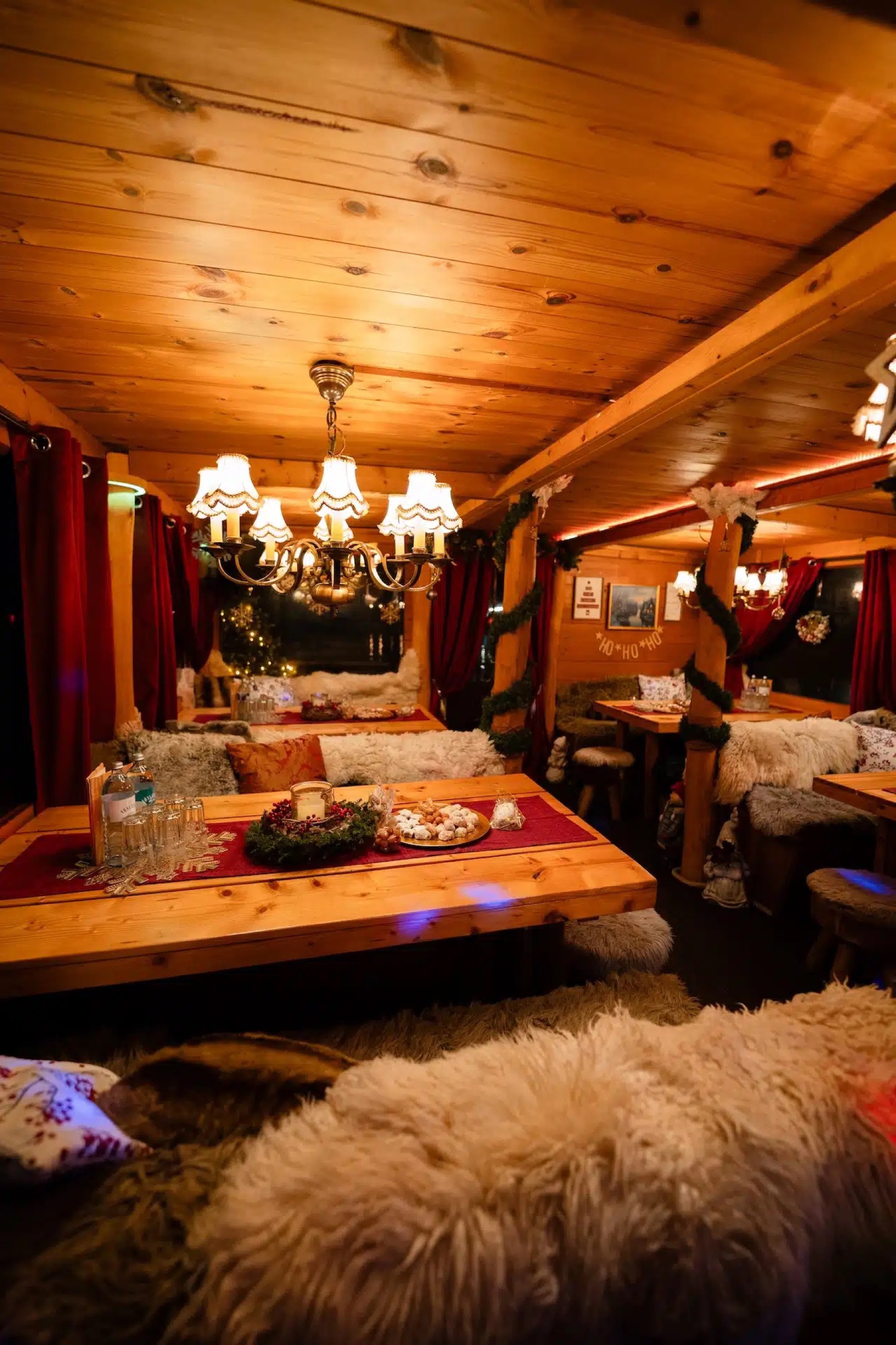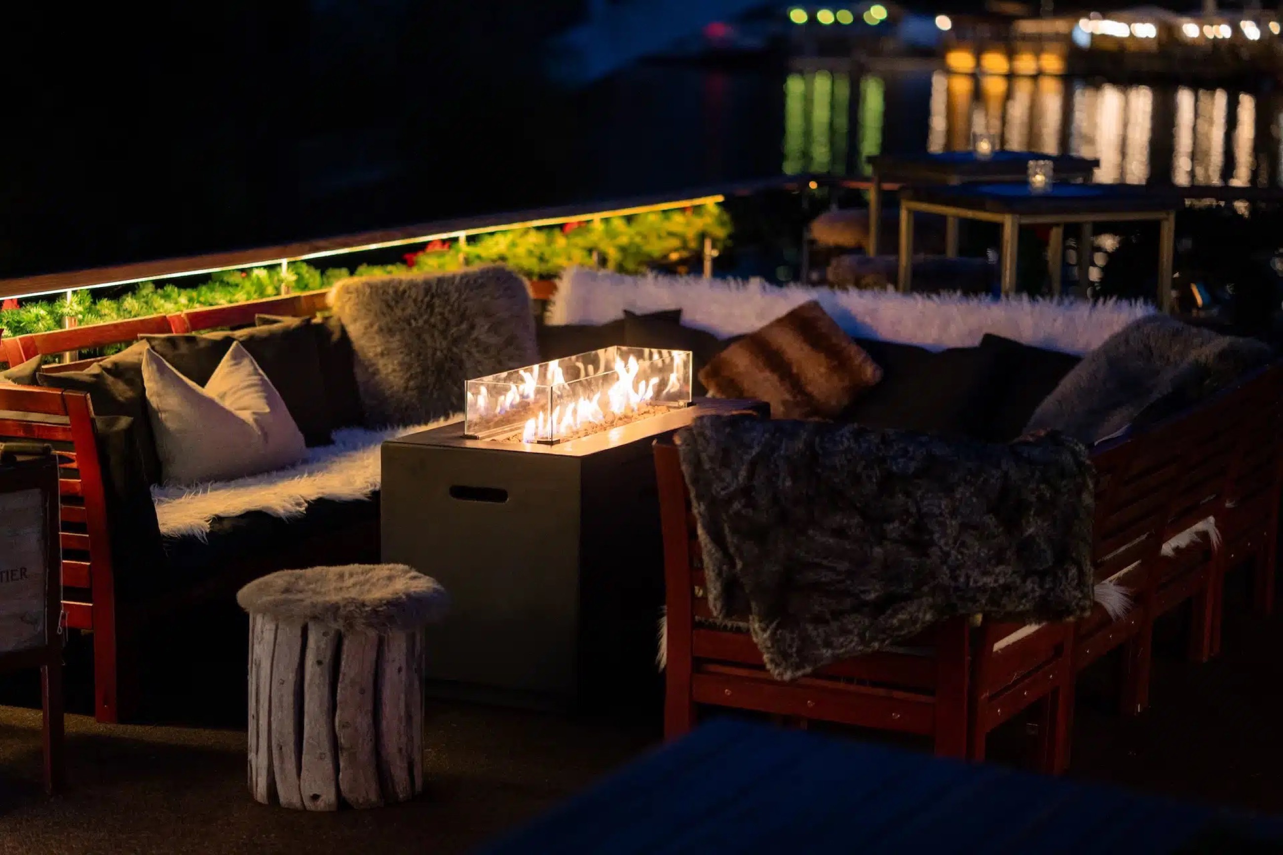 Ein Elektrokamin, Felle, Kissen, Teppiche und gemütliche Loungeecken verwandeln unser Hauptstadtfloß II in eine schwimmende Winterhütte. Dank wohliger Temperaturen von rund 25 °C fühlt sich jeder an Bord sofort wohl. Unser freundliches Service-Team serviert winterliche Getränke und sorgt mit passender Musik für die richtige Stimmung.